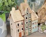 Featuring three townhouses with tiled effect roofs. Finished in a array of grey and blues, this charming long country tealight house will look lovely when displayed in your home.