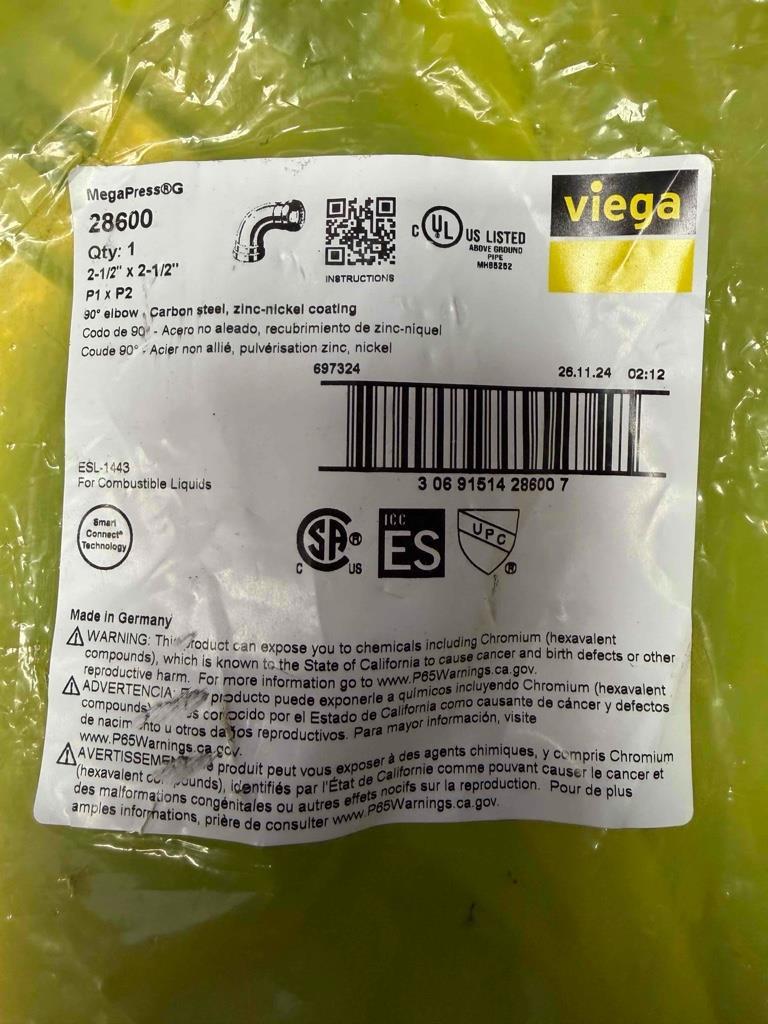 - NEW Viega MegaPress G 28600 90 Degree Elbow Carbon Steel 2-1/2" x 2-1/2" P1 x P2