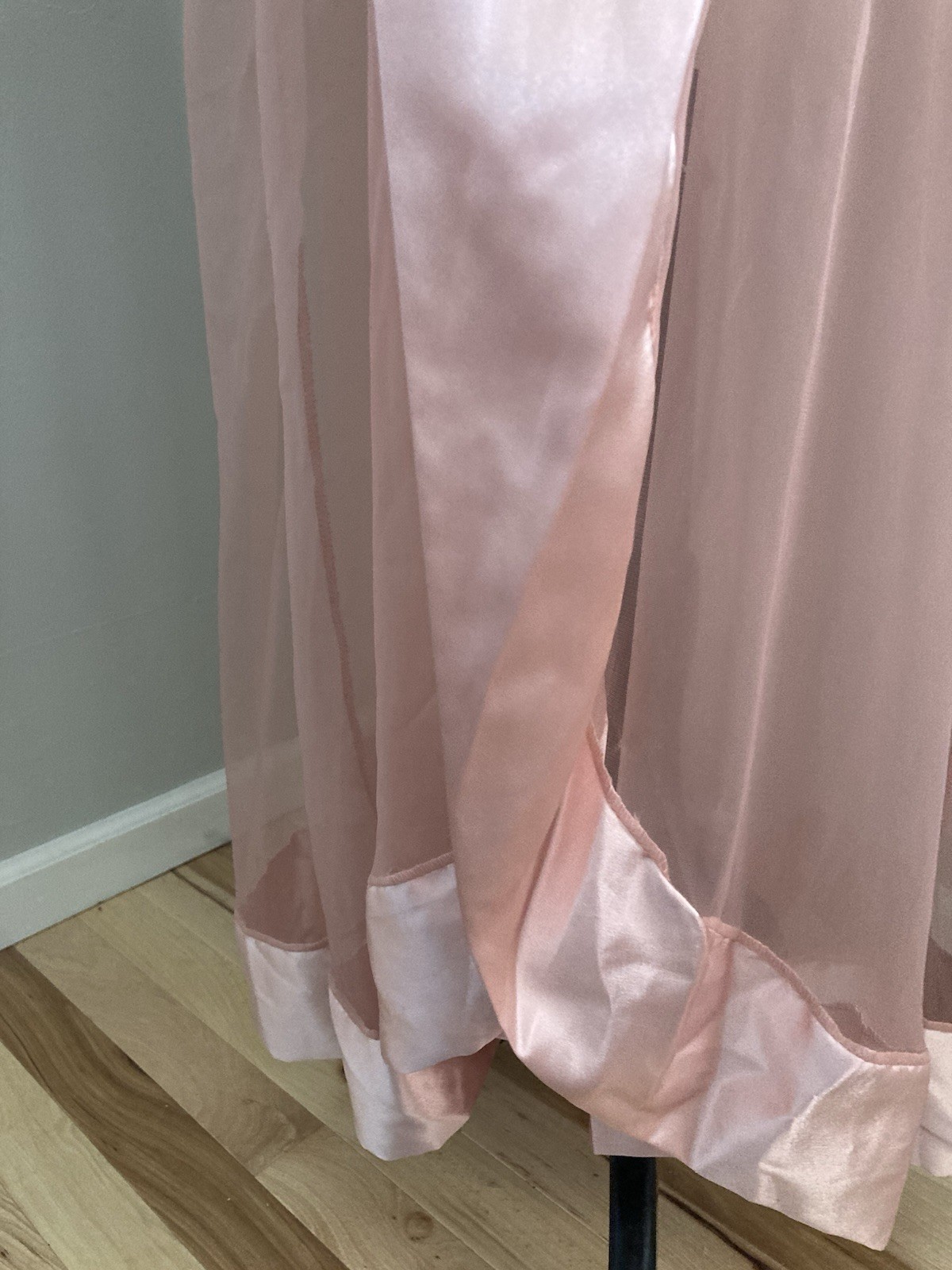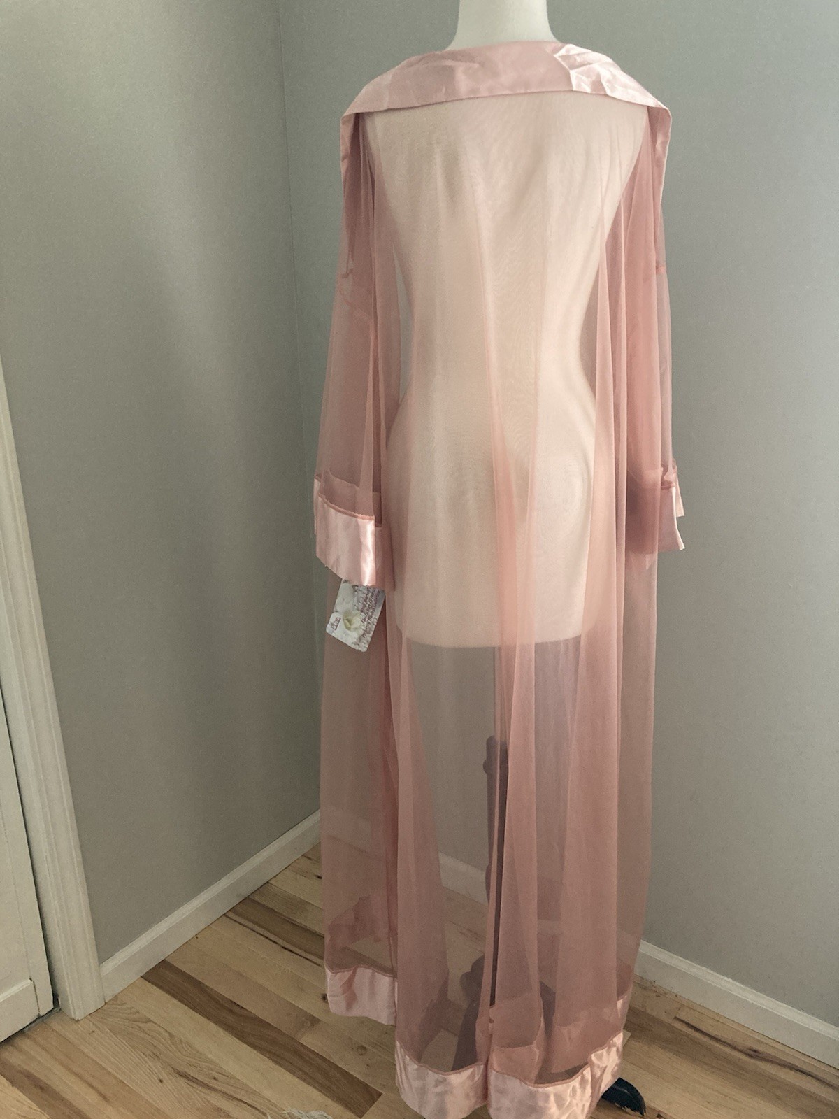 Petra Fashions, New Vintage Robe, with Tags. Sheer Nylon with Satin Trim, Shawl Collar trim goes to hem with curved corners. Made in the USA.