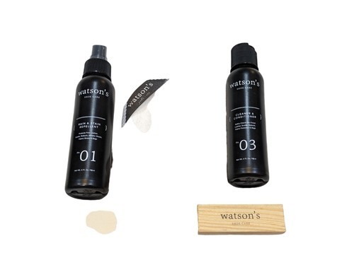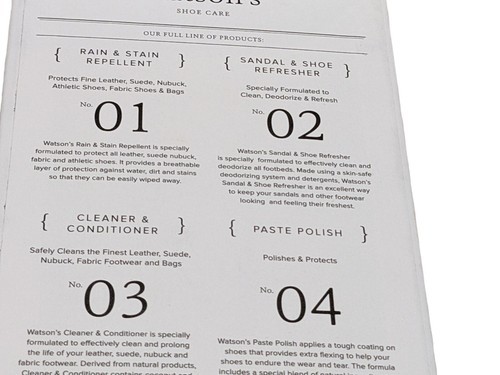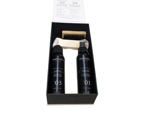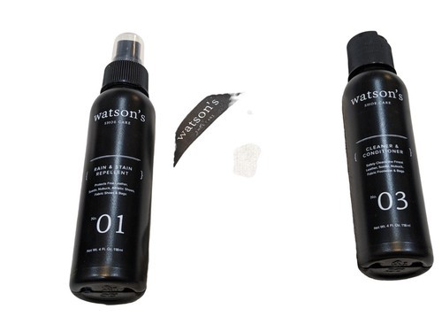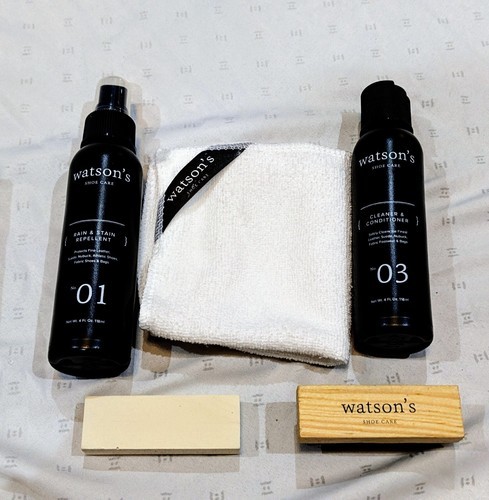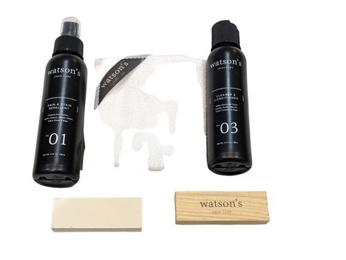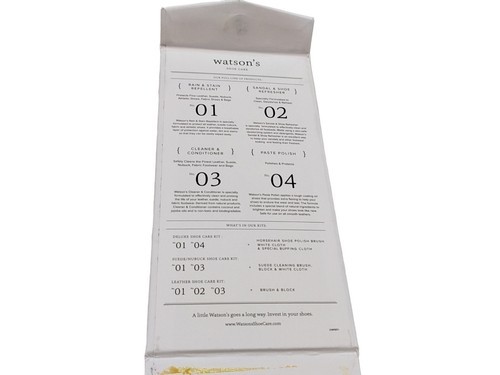 This is a brand new Watson 5 piece shoe care kit. Features a 4 fluid ounce bottle of cleaner and conditioner. A 4 fluid ounce bottle of stain repellent and rain repellent. Brush and microfiber rag as well as a gum eraser for the soles.