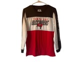Official NFL Team Apparel long sleeve shirt featuring the Tampa Bay Buccaneers. This shirt has a bold colorblock design in black, white, and red, with ?Tampa Bay Buccaneers? text and team logo across the front. Buccaneers team name also printed along the sleeve for added style. Made with a comfortable cotton/polyester blend, perfect for game day or casual wear.
