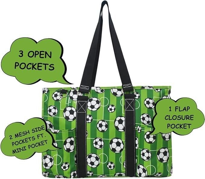 MATERIAL AND FEATURES: Score big with this durable canvas tote, featuring a reinforced bottom board and easy-to-clean surface. It has two front open pockets, two rear Velcro pockets, mesh side pockets, and a mini pocket for quick grabs, plus a smooth-gliding top zipper. Perfect for soccer moms managing gear, water bottles, sports drinks, and more. Stay organized and stylish on and off the field!