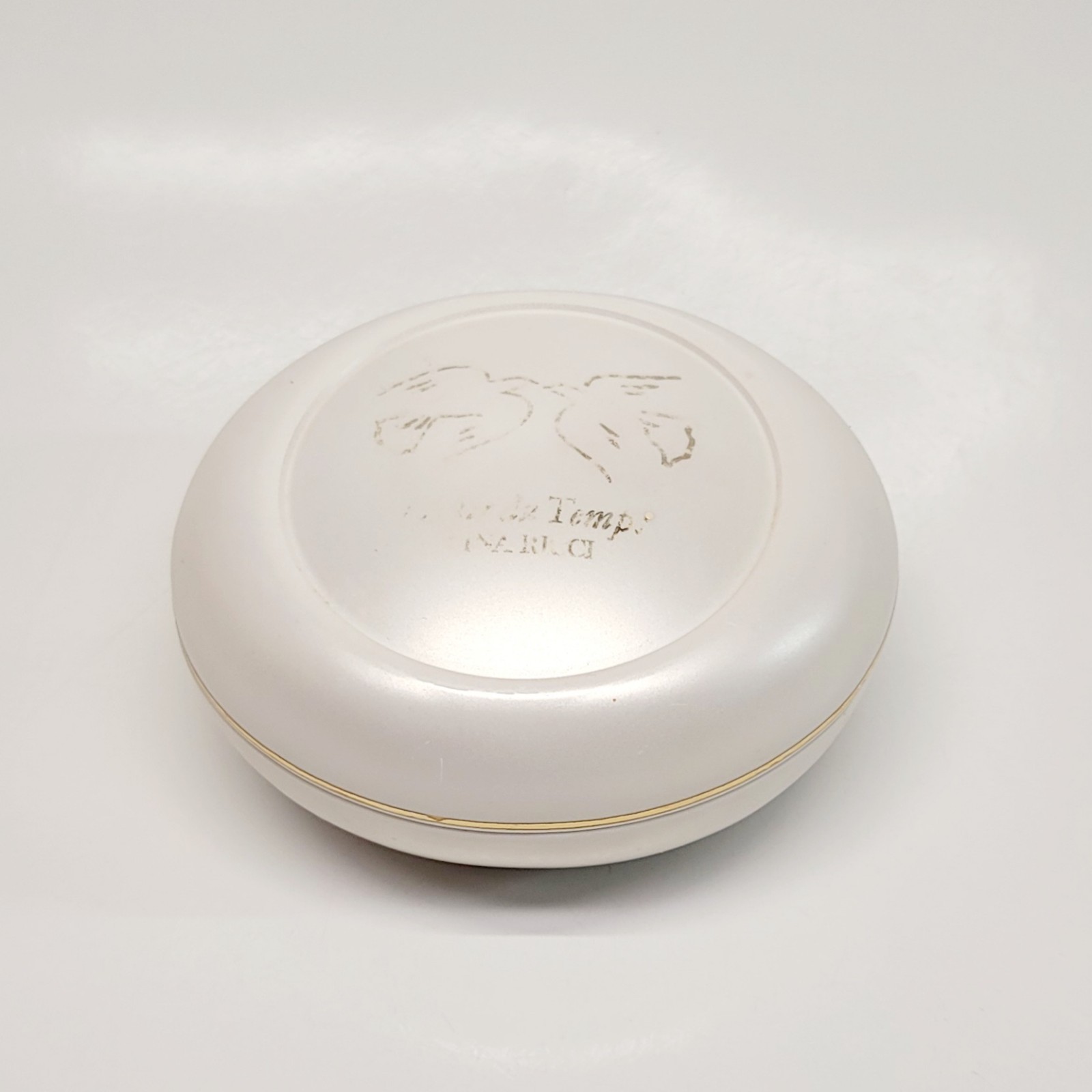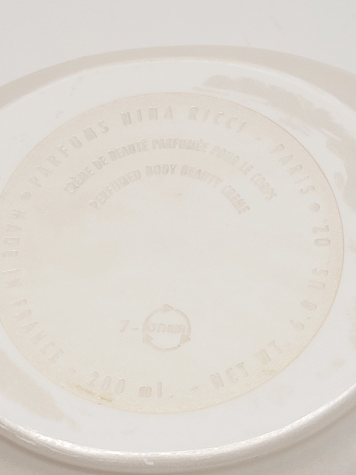 NINA RICCI L'air Du Temps Perfumed Body Beauty Creme Lotion Vintage 6.8oz Used. Includes brush. This creme is still mostly full and gently used. Rather than a traditional creme, it would be more closely related to a perfumed pressed powder. The pearlescent container is in good condition but the decal on top is mostly worn off, as well as some spots of the gold ring.