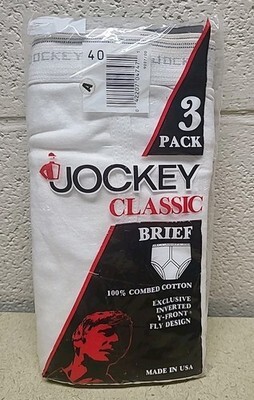 This product is a 3-pack of vintage Jockey Classic White Briefs in size 40, made in the USA in 1987. These solid white briefs are made of cotton jersey fabric, making them comfortable for all seasons. With the classic Jockey brand and style, these machine washable underwear are a timeless addition to any man's wardrobe.