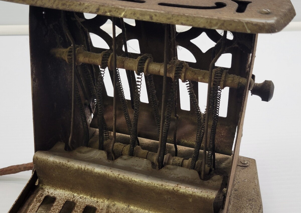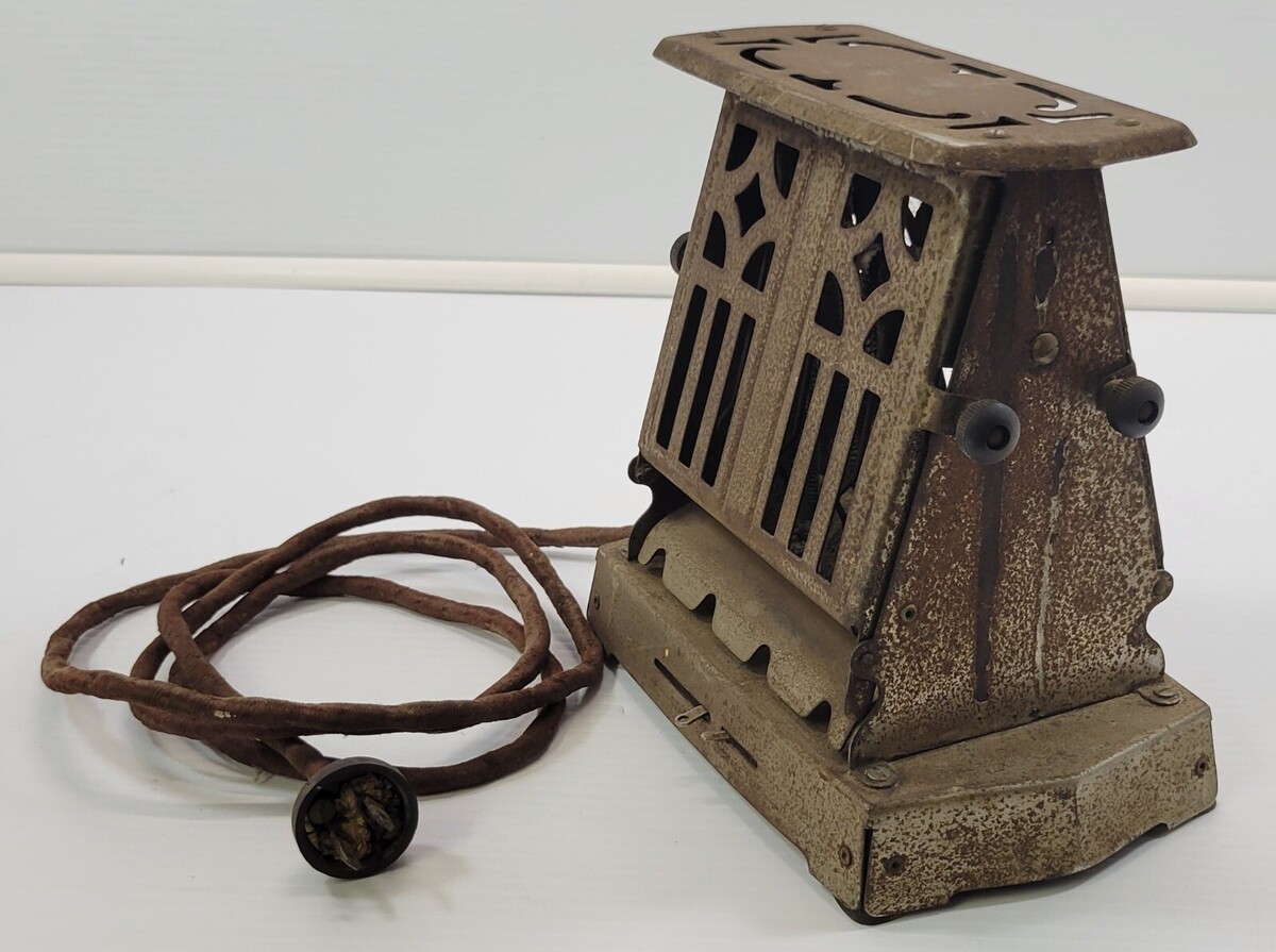 Toaster is NOT in usable condition. It is an antique piece with frayed electrical wire that is NOT SAFE to test. Toaster shows signs of age including dings, dents and surface rust. Seems like a solid piece making a good candidate for restoration.