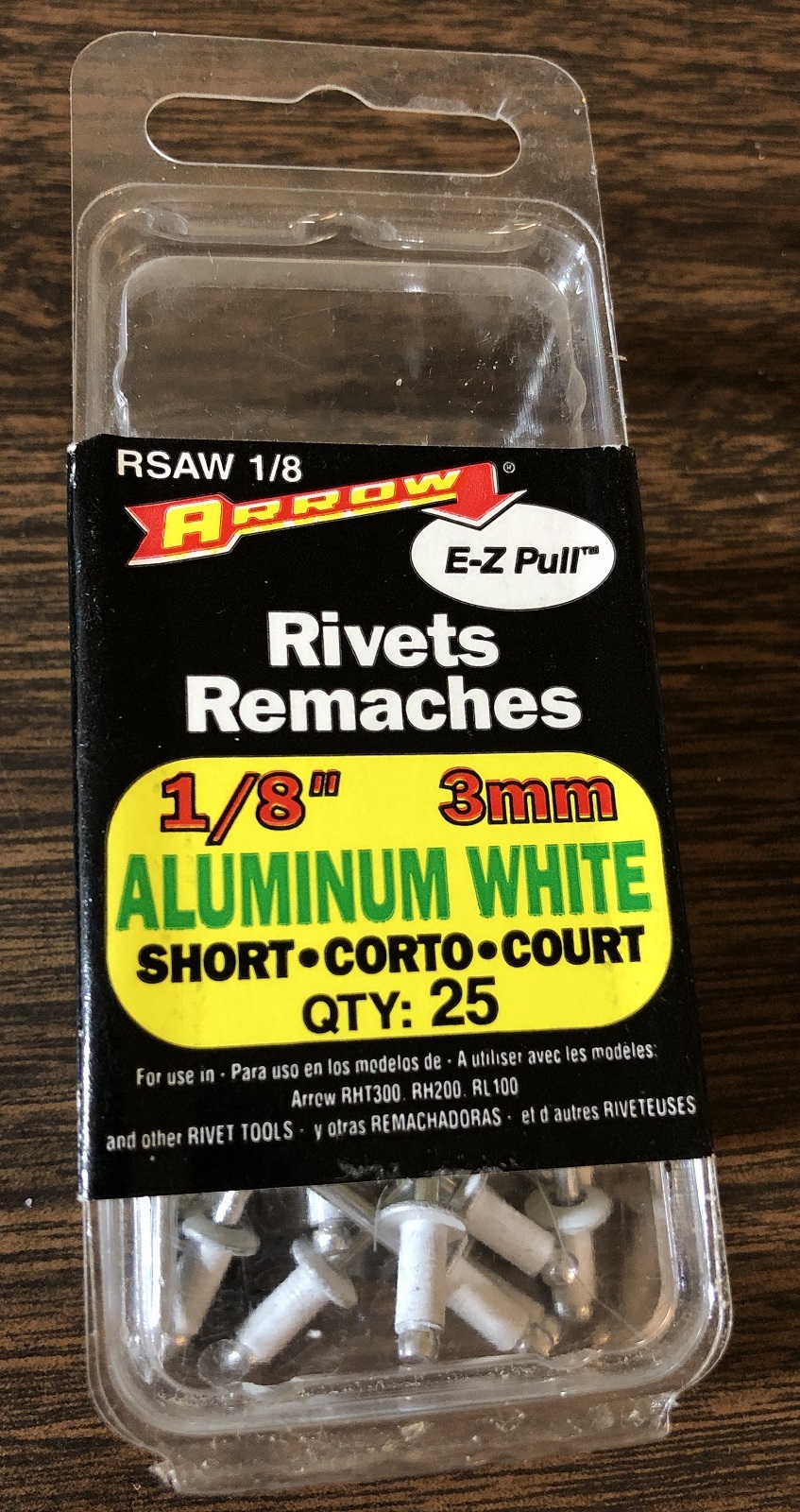 NOS Arrow Fastener Aluminum RSAW White 1/8-Inch (3mm) Short Rivets (25-Pack). Great for lighter weight jobs and materials such as aluminum fabrics plastics leather and more. Use with Arrow RHT300 RH200 and RL100 rivet tools.