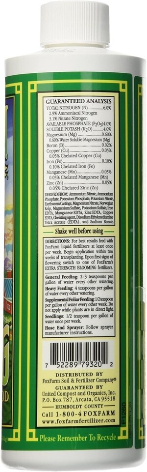Allow new plantings a few days to settle in, then begin using at the rate of two teaspoons per gallon of water every other time you water. For best results, use it for foliar feeding by applying to both sides of leaves in the early morning. At the first sign of flowering, switch to a blooming fertilizer!