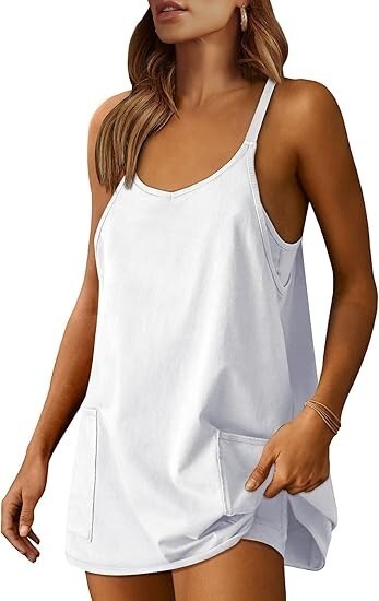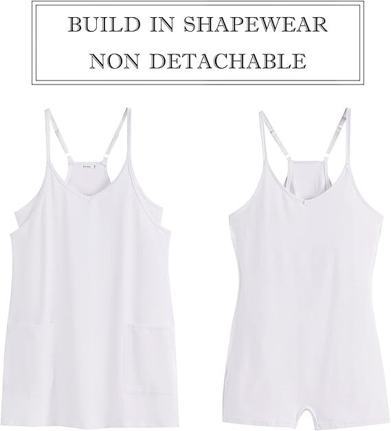 Features - This workout mini dress build in shapewear featured spaghetti straps, V neck, patch pockets, solid color, making it perfect for staying cool and stylish during hot summer days.