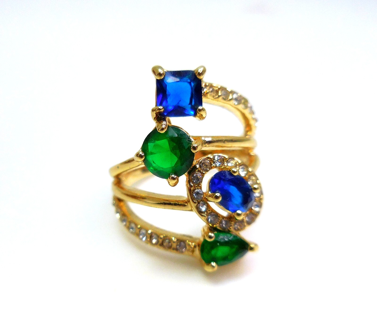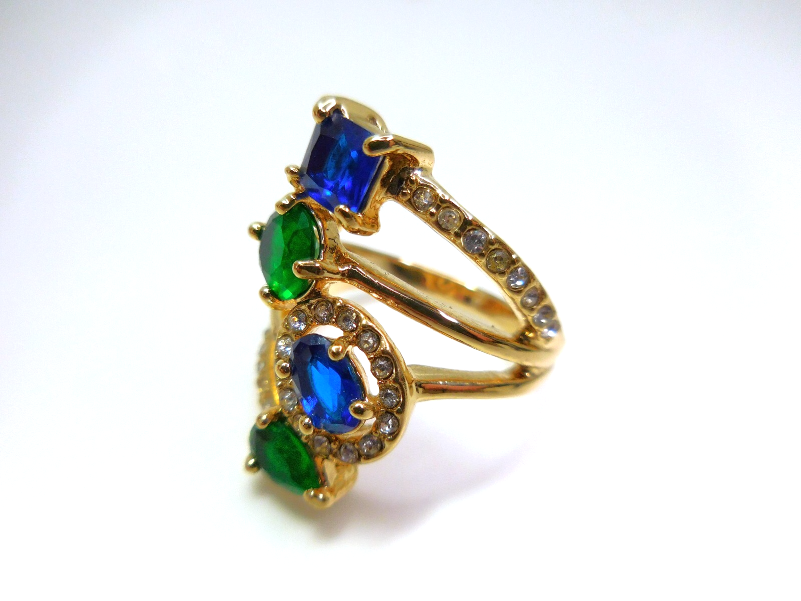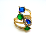 Beautiful and colorful retired Avon cocktail ring with deep green and blue open back stones and small round clear white rhinestones for a touch of sparkle. Size 8, Gold Tone, A mix of Square, Round, Marquis and Oval Cut stones. Purchased and yet never worn so the finish is as new as when made. All stones are present.