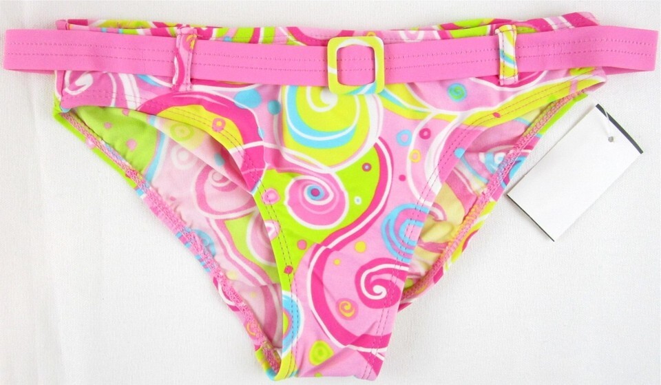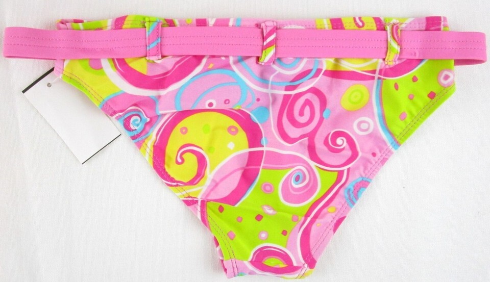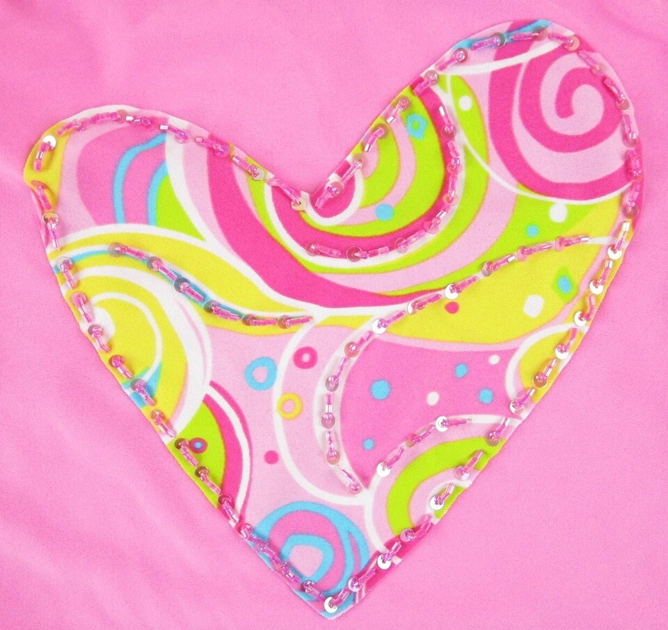Two piece tankini swimsuit has a pink top with straps that cross in the back. A big colorful heart on the front is embellished with pink beads and sequins.The print on the bottoms matches the print on the heart. The bottoms have an attached pink belt. The front of both pieces is lined.