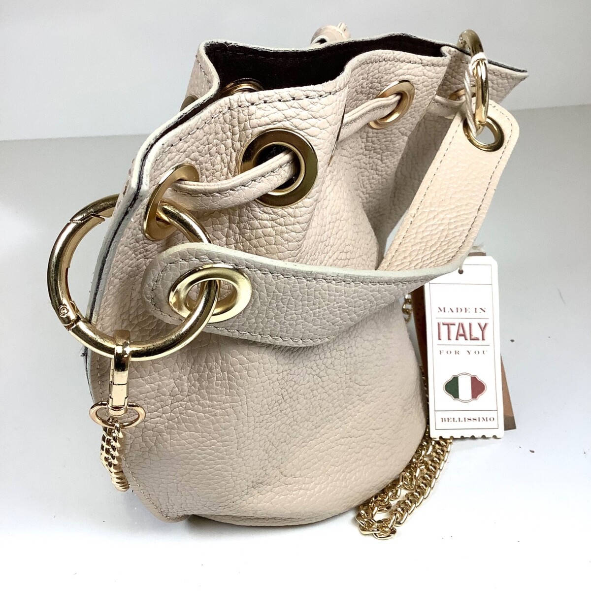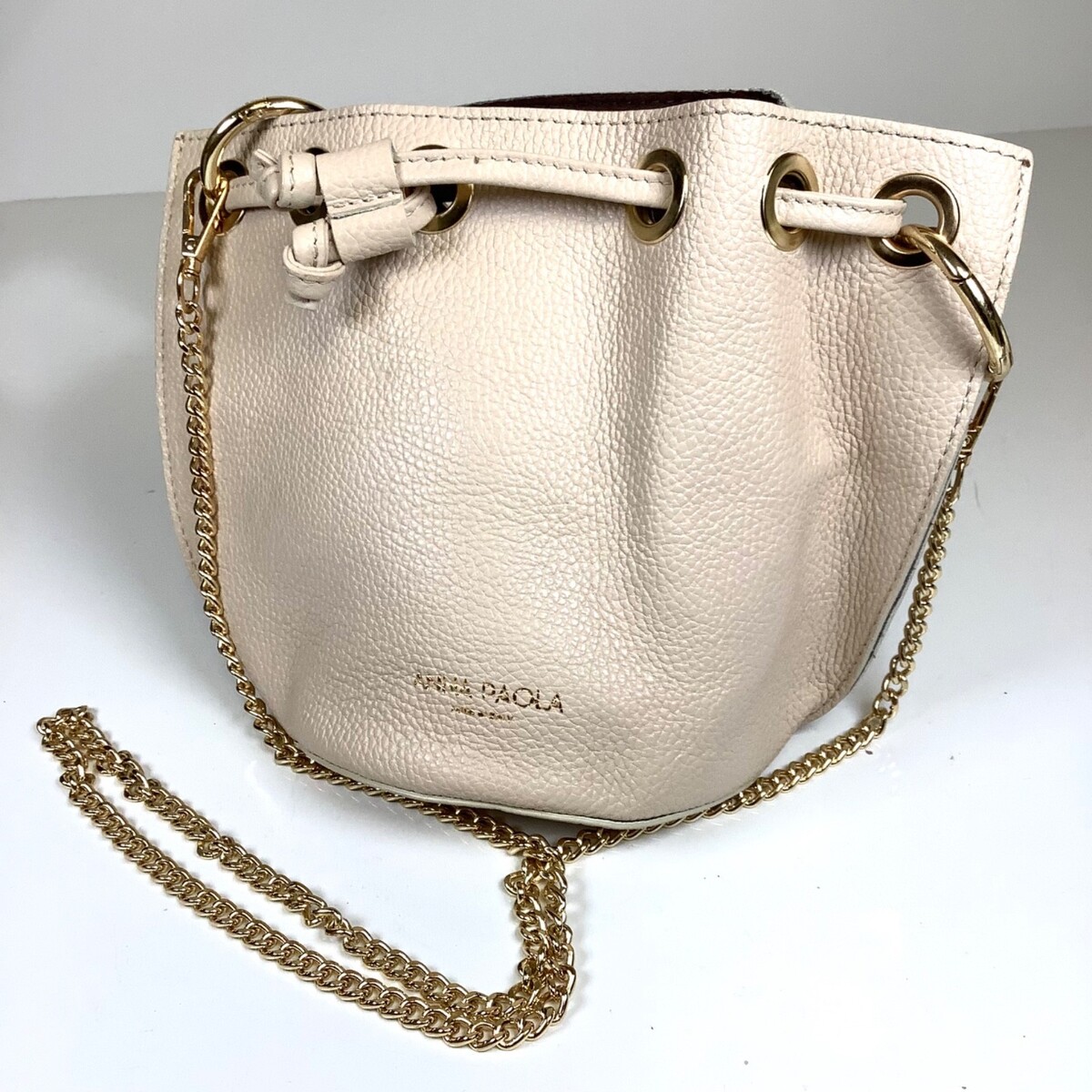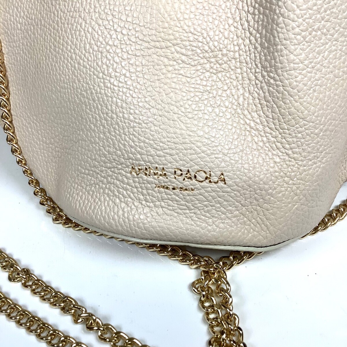 - NWT Anna Paola Italian Genuine Leather Bucket Bag In Prosecco Beige w/Chain NEW