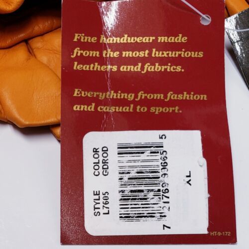 Keep your hands warm and stylish this winter season with these Grandoe leather gloves. The orange goldenrod color adds a pop of brightness to any outfit, while the unlined interior provides a comfortable fit. These gloves are perfect for women who want both fashion and function. The sheepskin leather material ensures durability and softness, making them a great addition to your winter accessory collection. The gloves are brand new with tags and come in size XL.