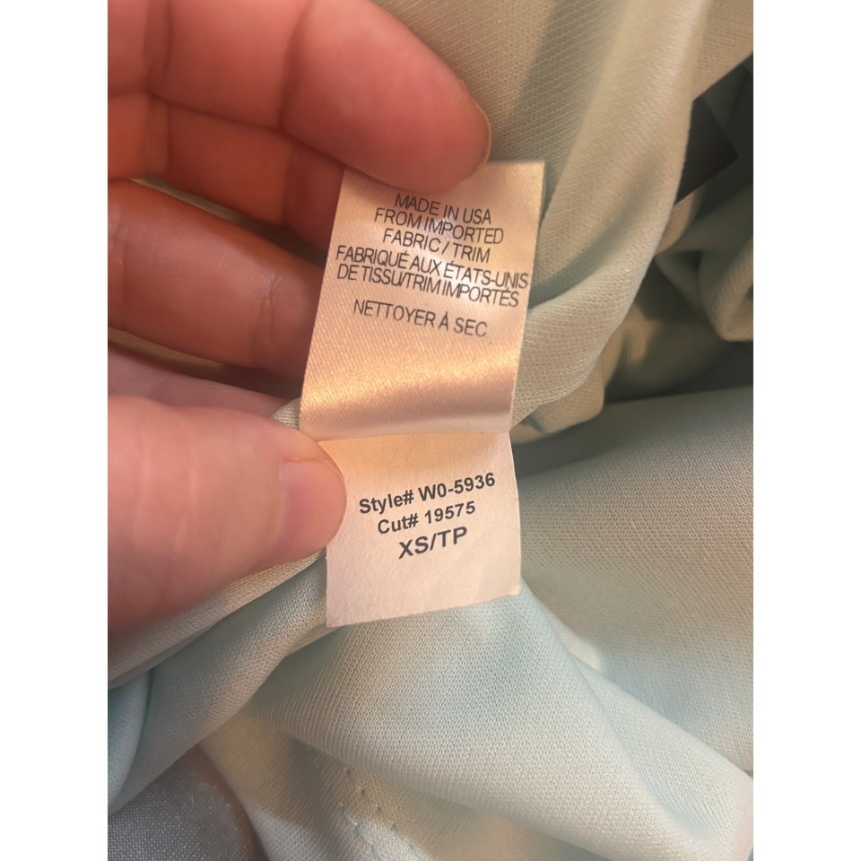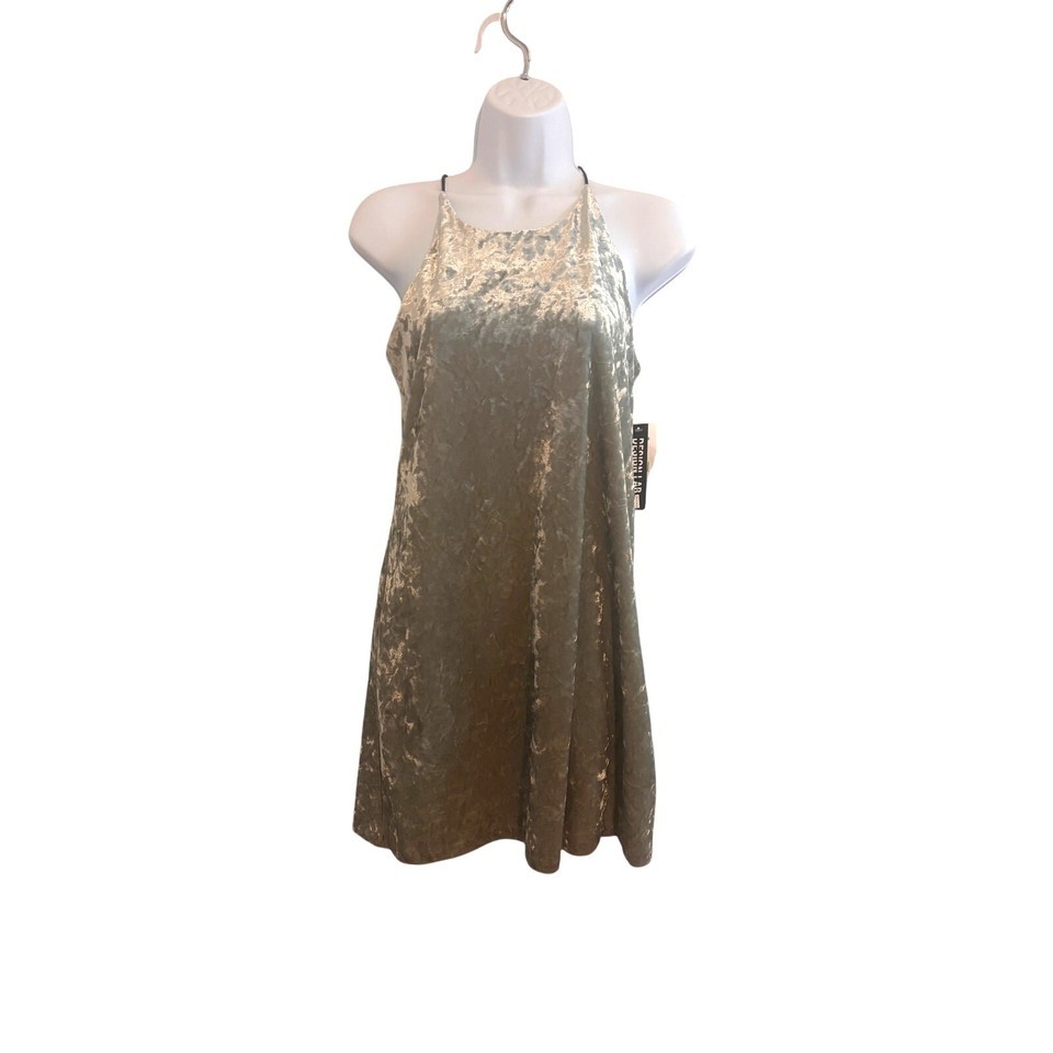 Halter style dress that is sage green with a silver shimmer. Lined with mint green material. Straps are thin elastic.