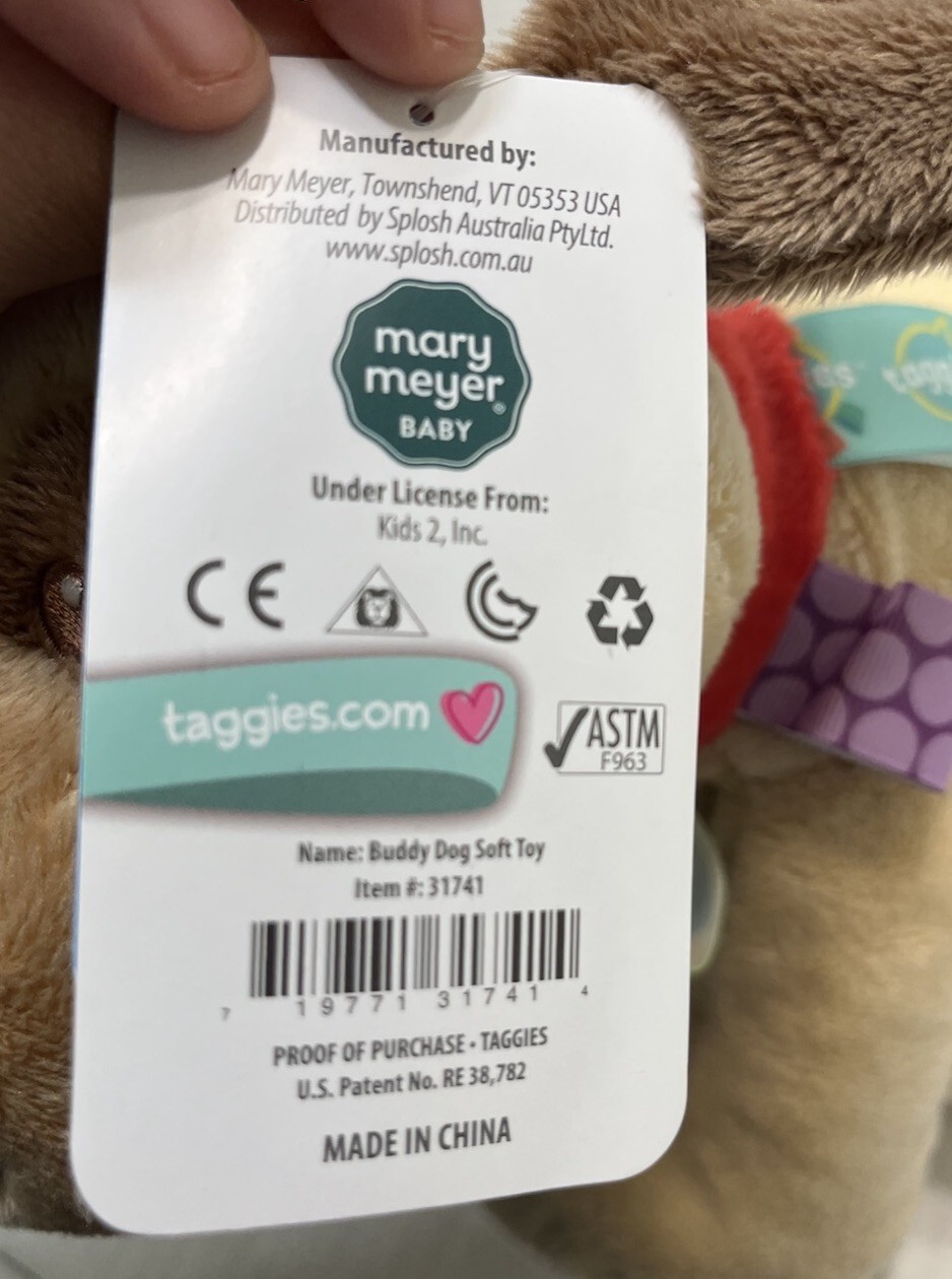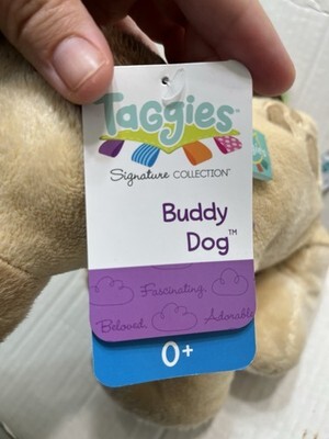 The NWT Taggies Puppy Dog Buddy Plush is a 12" tan beanbag stuffed animal from the Signature Collection by Mary Meyer. This adorable plush toy features a puppy dog design that is perfect for baby boys and girls alike. With its soft and cuddly texture and cute dog theme, this Taggies plush is sure to become a beloved companion for any little one. Please let me know if you have any questions!