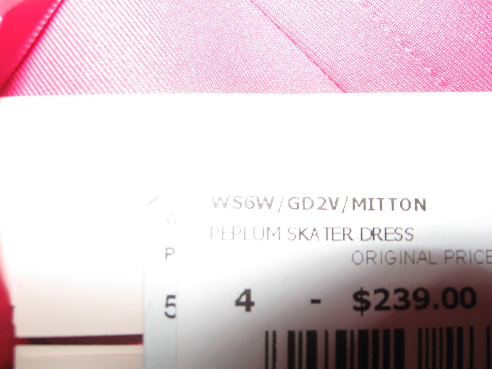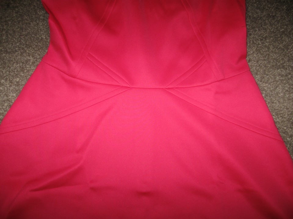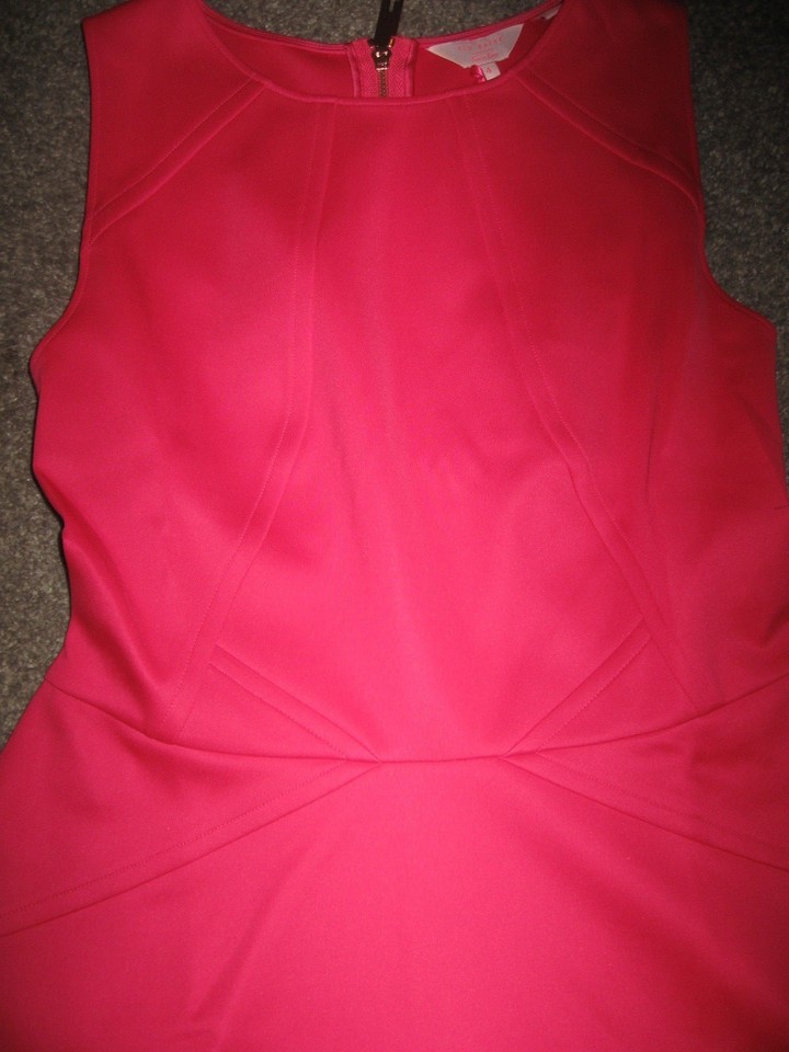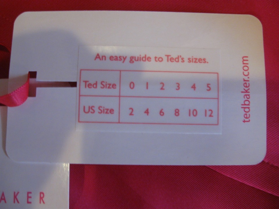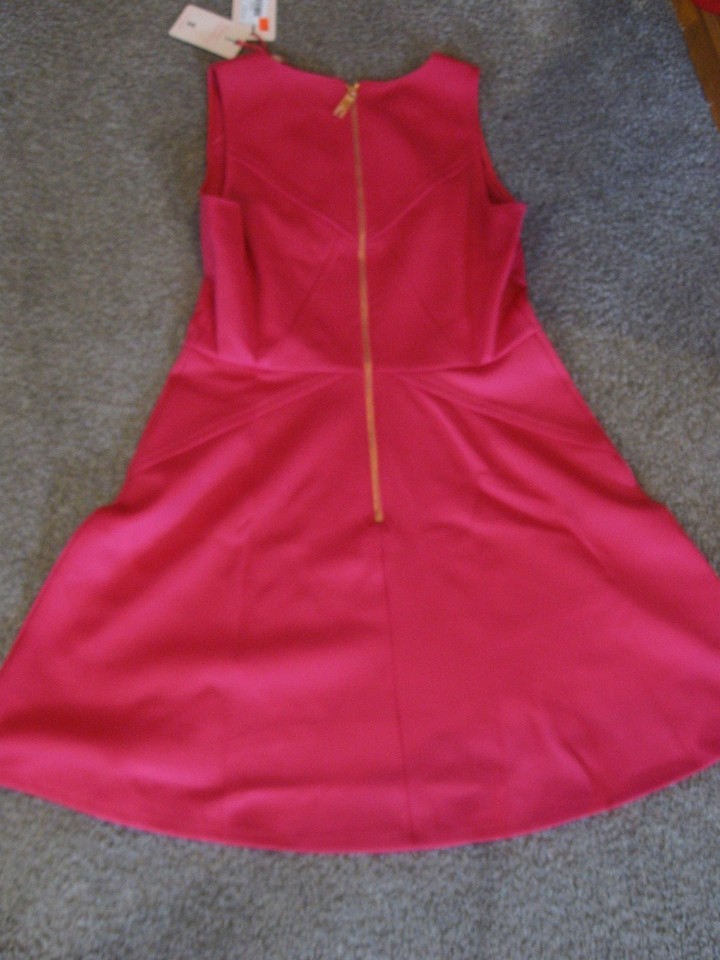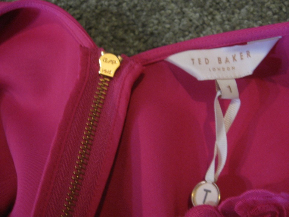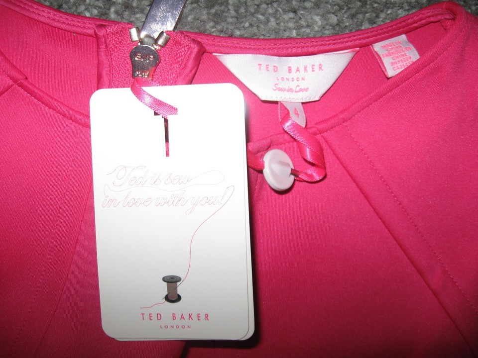 This is great dress. This is the famed Ted Baker and you gotta love it. This is the special edition dress ("sew in love"). Mitton code. Fuchsia or Pink color. 88% Polyester and 12% elastane.