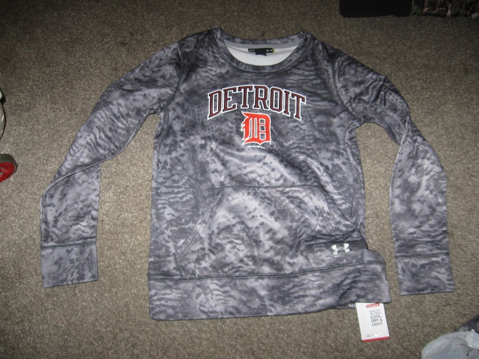 NWT Under Armour Boys girls Detroit Tigers Sweatshirt Sweater color - camo gray 10 / 12 This is a a great Tiger sweatshirt . This is Youth Large, but could also be women's XS. Please look at dimensions and you will see. Condition: MINT with Tags dimensions: arm pit end of sleeve - 18 in top of collar to bottom (total length) - approx 23 inches across chest (armpit to armpit) - 17 inches