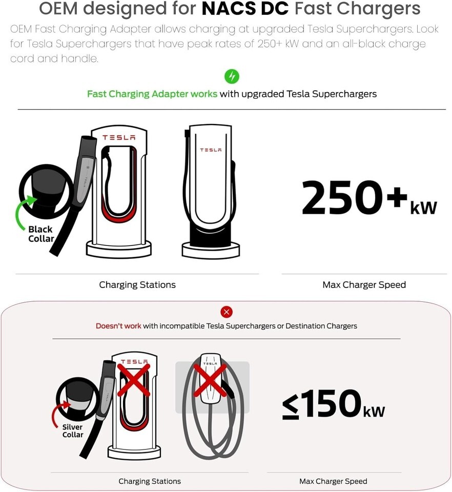 ??Reminder?The LEPPEIN NACS to CCS1 adapter is compatible with all CCS1 electric vehicles, but its charging capability depends on the vehicle model authorization and the upgrade status of the Tes la Super chargers. Owners should check with their vehicle manufacturer and the Supercharger network to confirm compatibility
