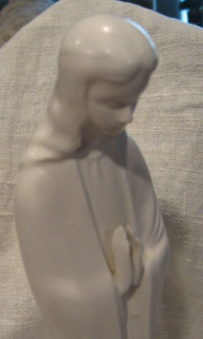 This lovely figure is Mary in a serene, peaceful pose. Her head is bowed and hands held in prayer. Her long hair cascades down her back.The base shows maker's mark with original foil seal. Napocoware was National Potteries Company of Cleveland OH. This figure was manufactured in Japan in the 1960's. Soft ivory porcelain in a satin finish. No flaws found. Base is 2.5" square and figure stands 11.5" T Be sure to look for other religious themed items in my booth.