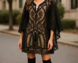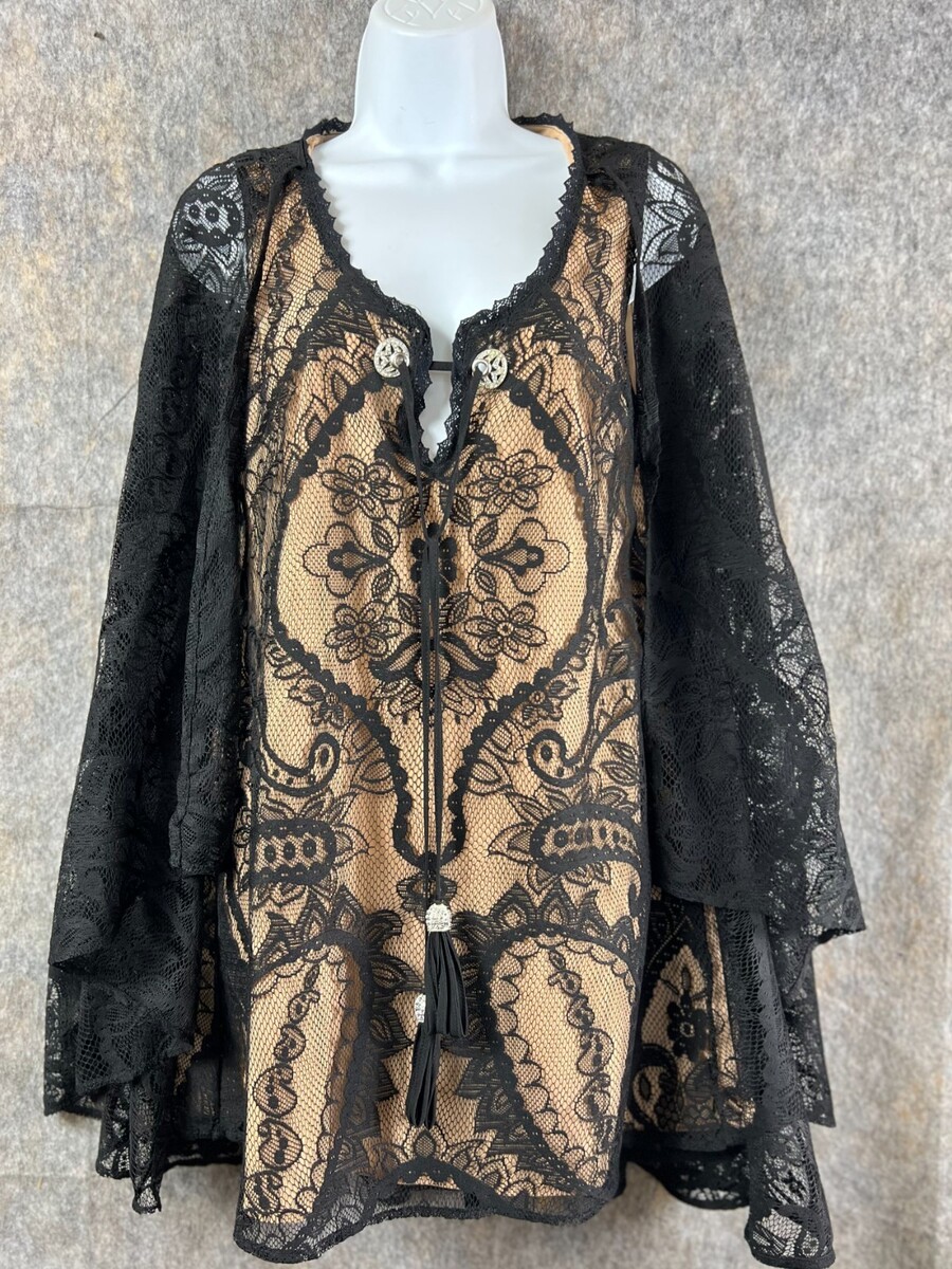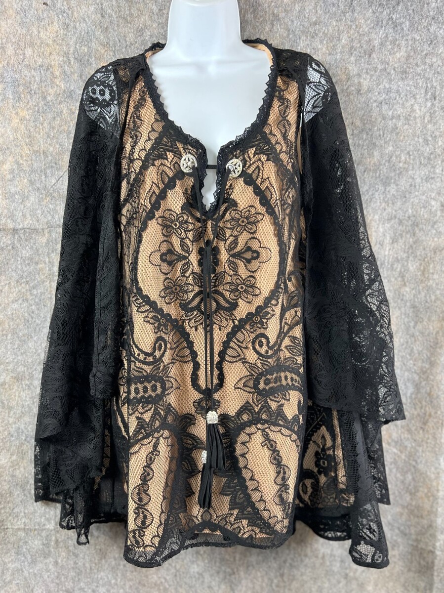 Elevate your wardrobe with this stunning Nasty Gal black lace tunic dress, style NGM021667DW. This eye-catching piece features intricate floral lace overlay with a nude lining, giving a sheer, sultry contrast. Designed with dramatic bell sleeves and a scalloped hemline, it adds a touch of boho glam and gothic edge. The dress has a flattering V-neckline with tassel ties and measures approximately 32" in length. Perfect for nights out, parties, or special events.