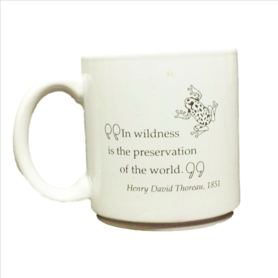 Save the Rainforest on a leafy background with a blue frog on the front of the cup. On the other side "" In wildness is the preservation of the world"" Henry David Thoreau, 1851