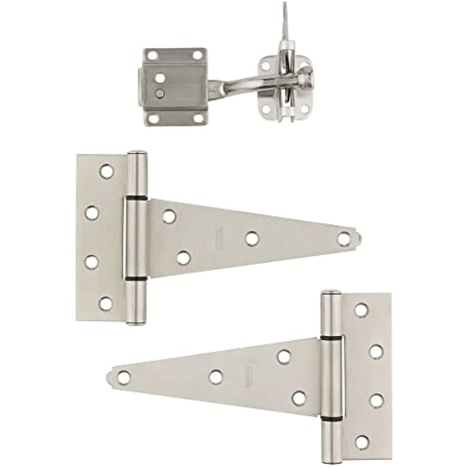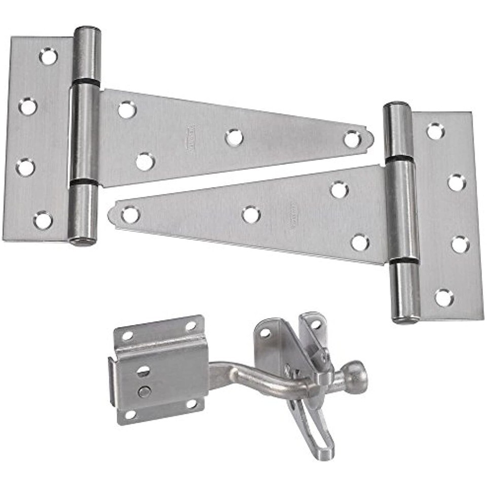 Popular tee hinge and latch set includes two hinges, one latch and necessary fasteners