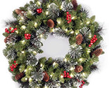 Designed with a Crestwood Spruce branch base, this pre-lit artificial Christmas wreath is 24 inches wide and decorated with pine cones, berry clusters and frosted branches.