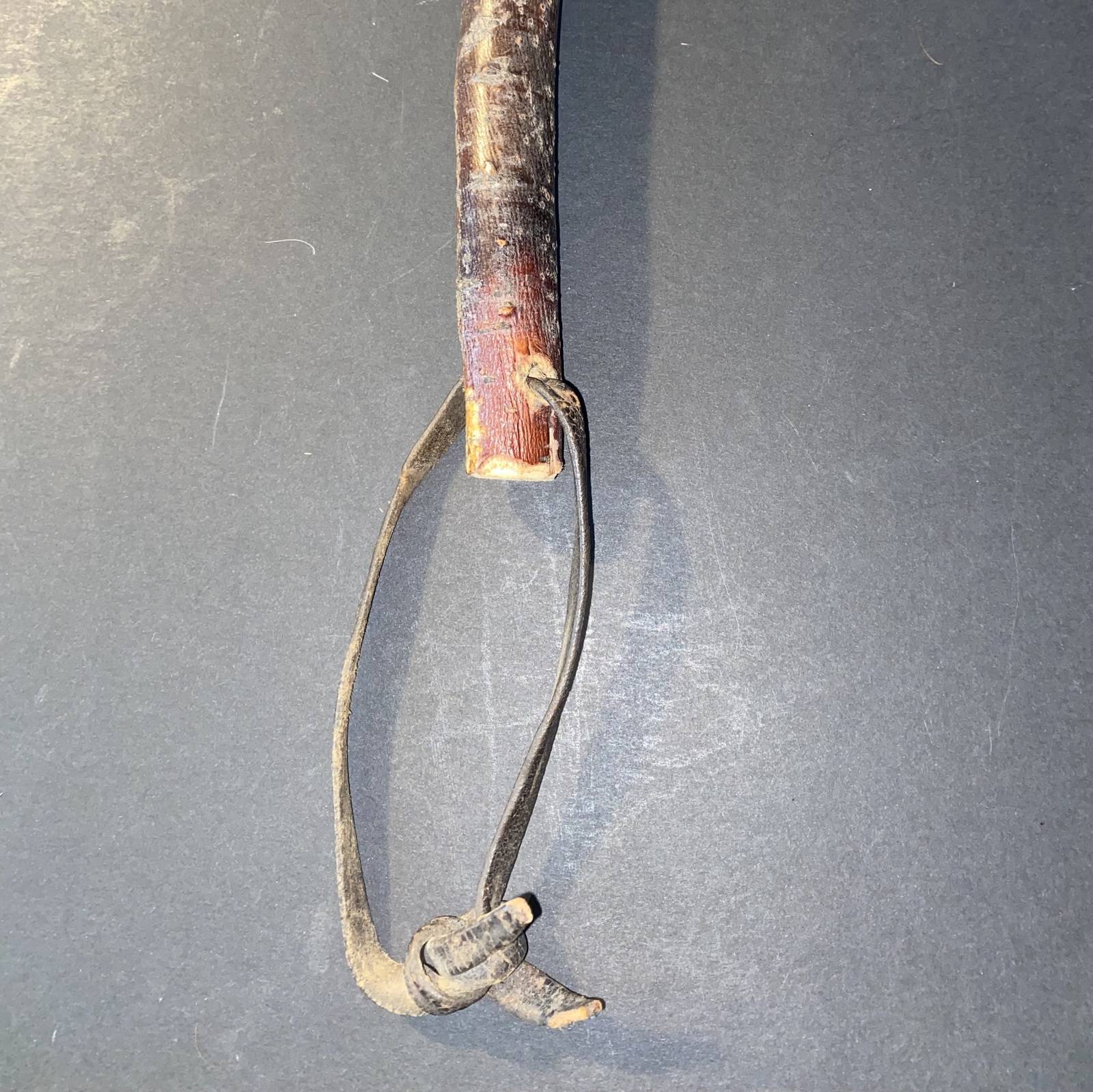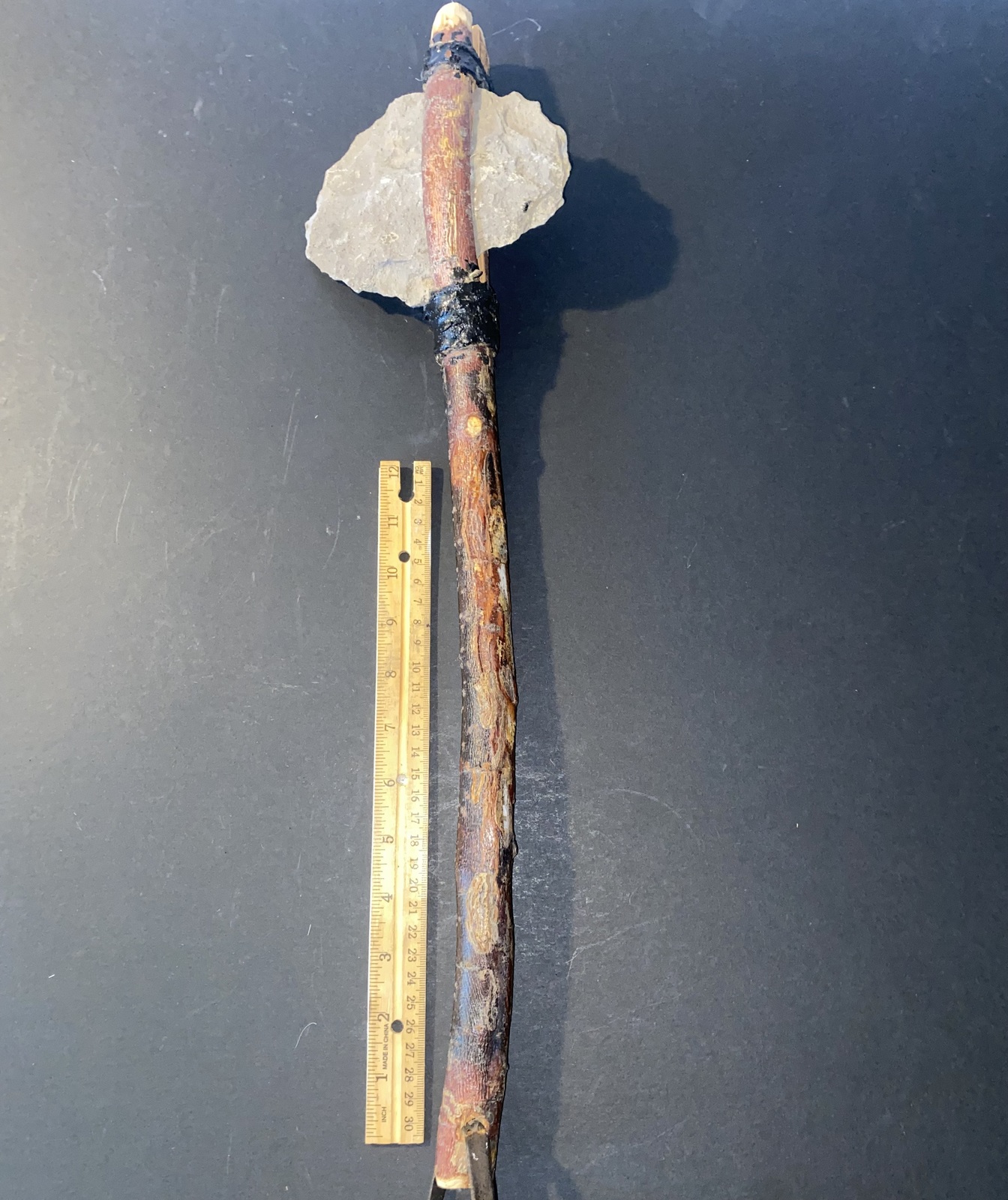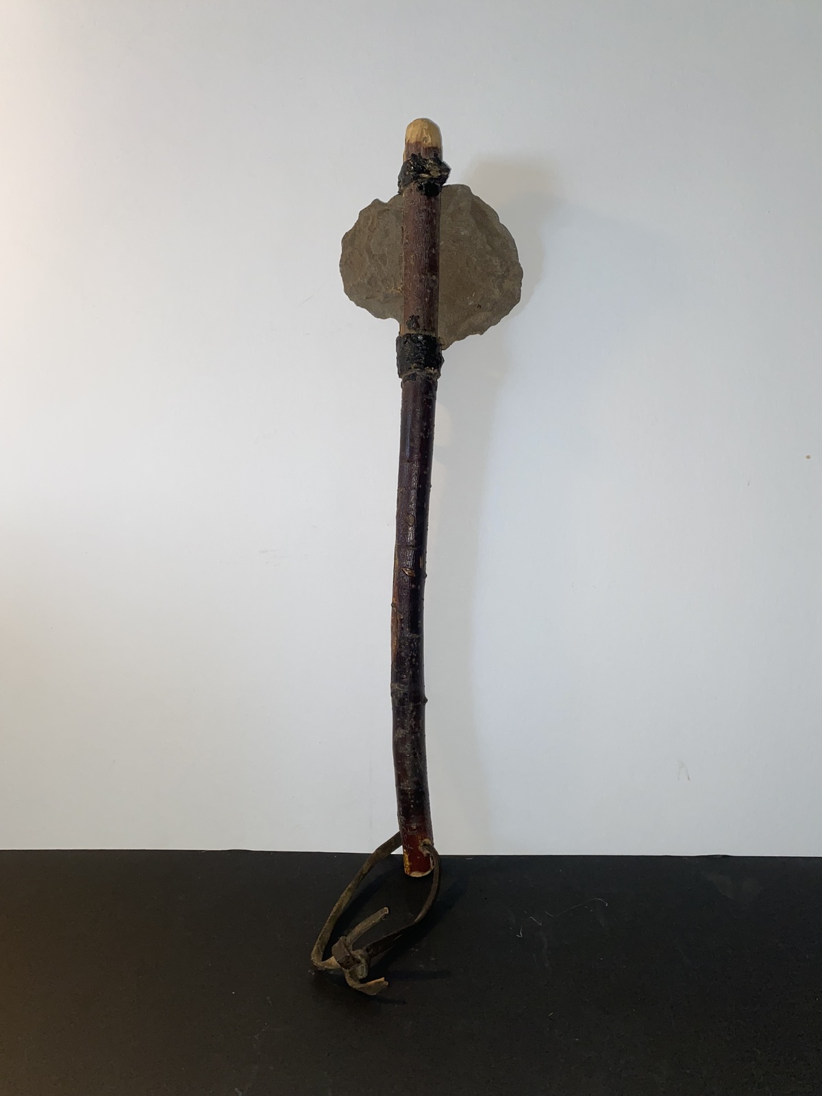 This listing features a handmade Native American weapon that has a 5 1/2' by 5" hand chiseled stone blade afixed to a 22" manzanita wood handle that also has a leather hand or belt loop. Also included is an oak and rawhide fighting shield that measures 20" by 10" and is made from animal skin that has been stained with a unique Native American design. We're not positive as to the age of these two items, but judging by the aged animal hide on the shield and the leather loop on the fighting axe, these are both fairly old.