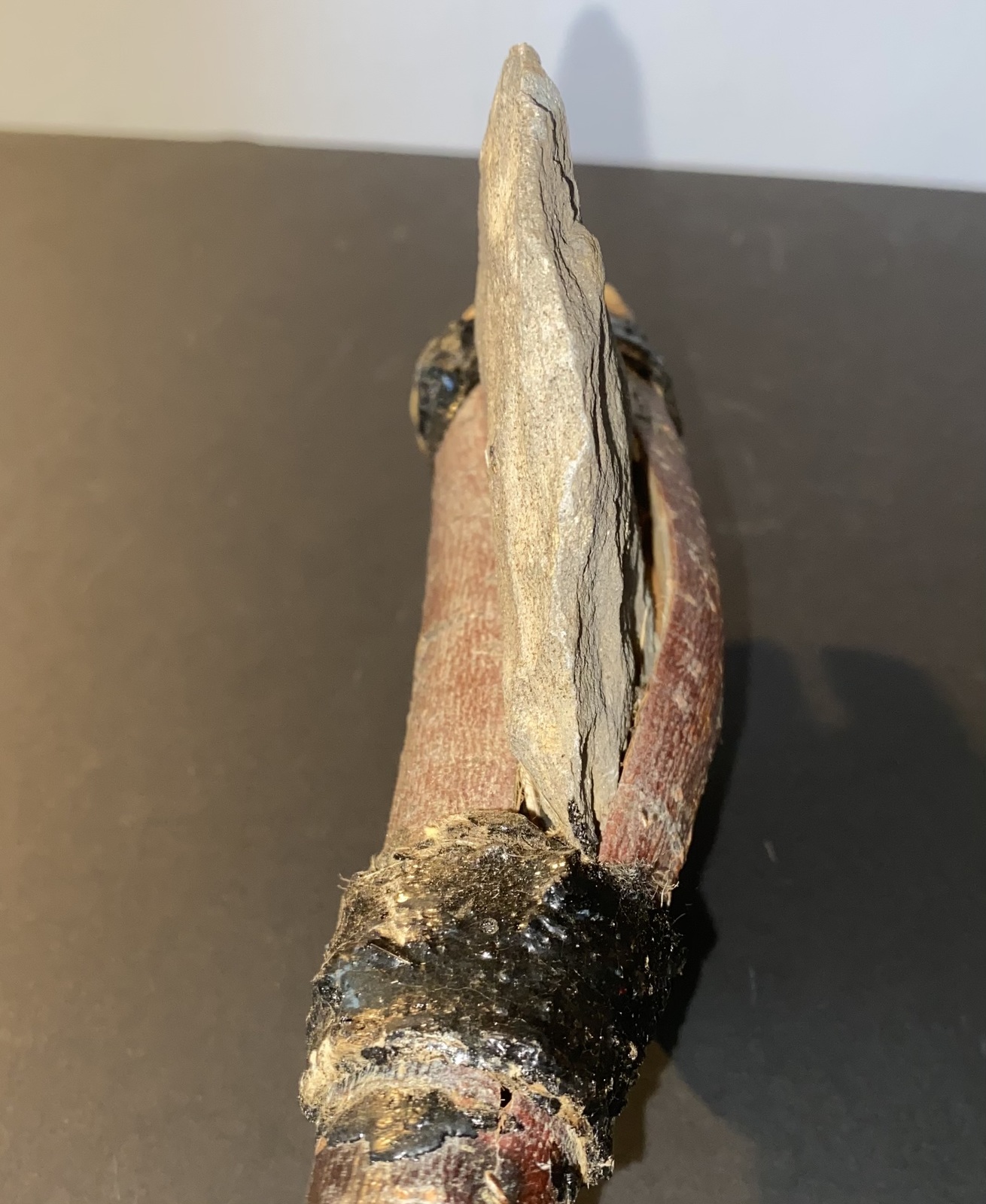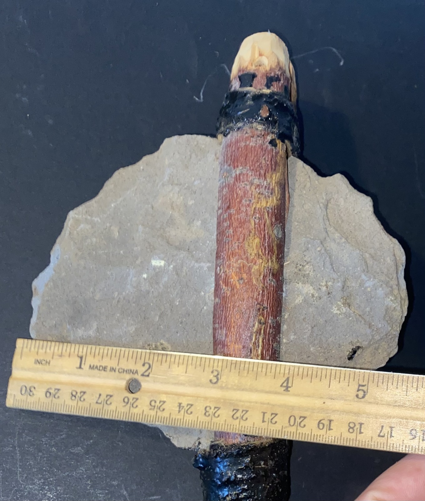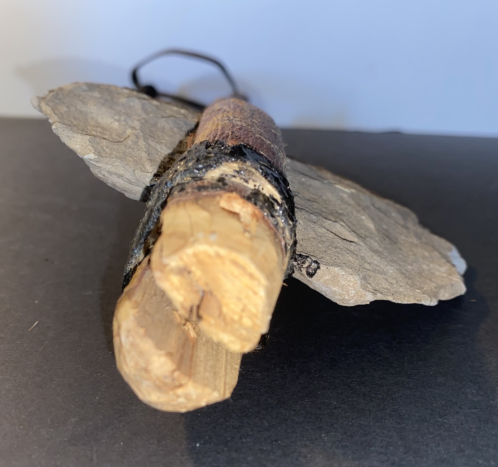 This listing features a handmade Native American weapon that has a 5 1/2' by 5" hand chiseled stone blade afixed to a 22" manzanita wood handle that also has a leather hand or belt loop. Also included is an oak and rawhide fighting shield that measures 20" by 10" and is made from animal skin that has been stained with a unique Native American design. We're not positive as to the age of these two items, but judging by the aged animal hide on the shield and the leather loop on the fighting axe, these are both fairly old.