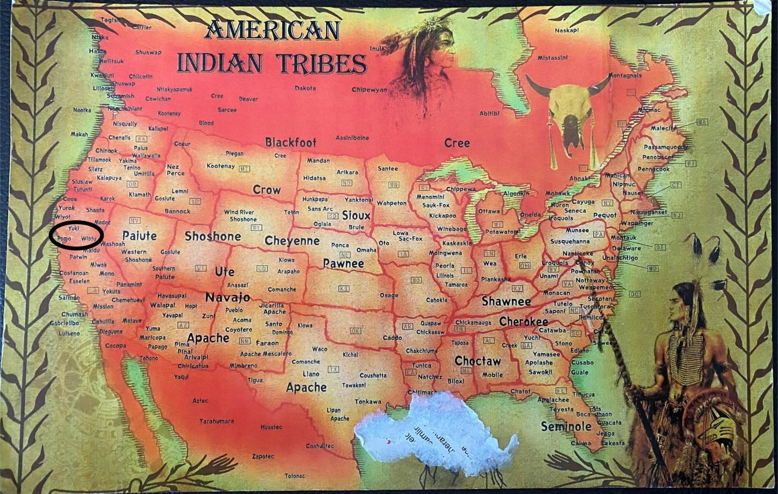 As for tribal affiliation, these were purchased at an Old West auction in far Northern California, about an hour from the Oregon border. Our last image shows a Native American tribe card that points out what Indian tribes lived in what areas of the United States. On that graphic we have circled in black the tribes that are native to the area where we purchased these two items. The tribes are Pomo, Wintu, and Yuki.