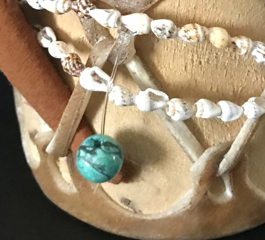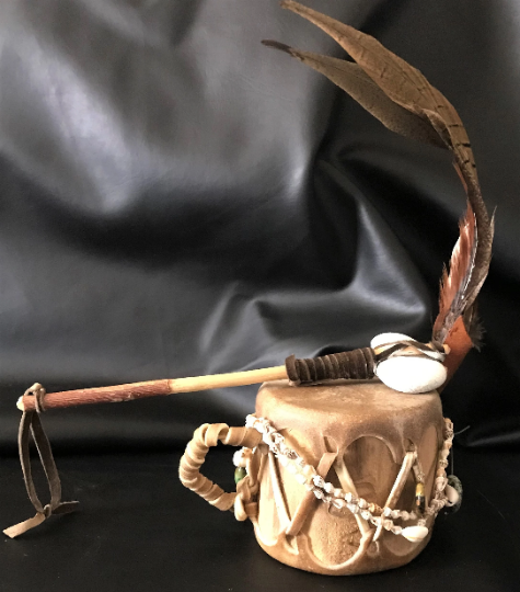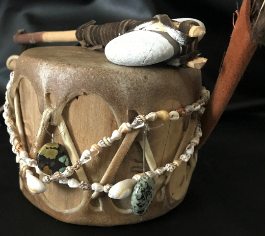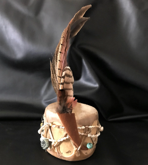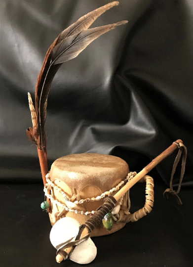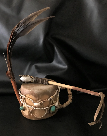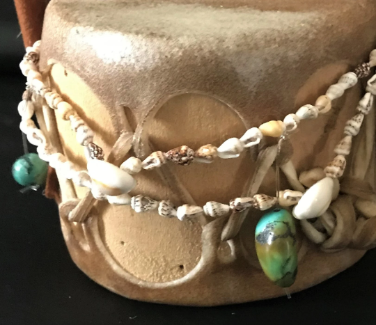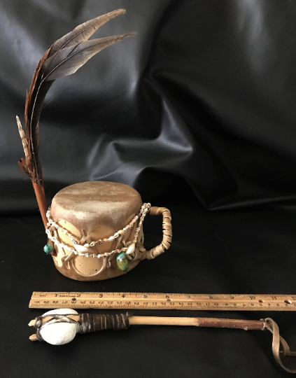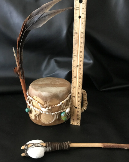 We acquired this native American birch bark drum and mallet at an annual old west auction. We thought highly enough of it to bring it to our store and offer it as a listing. Everything on this is made from natural materials from the birch bark body of the Tom Tom, to the animal hide and sinew, to the string of shells and the turquoise pieces that adorn this piece. Well actually, there is some monofilament line to attached to some of the pieces so that's obviously not natural but everything else is. The mallet is quite ingenious in and of itself. It's a very straight Manzanita stick and stone and leather all crafted quite precisely. Whoever made this had quite a bit of skill because it's not something you would actually see in a regular store but perhaps maybe in a local native American shop or expo. Please keep in mind that this is a very small instrument, please see our pictures with the ruler references.