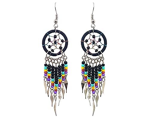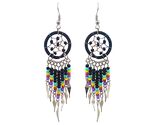 - Native American Inspired Dream Catcher Long Seed Beaded Metal Dangle Earrings -