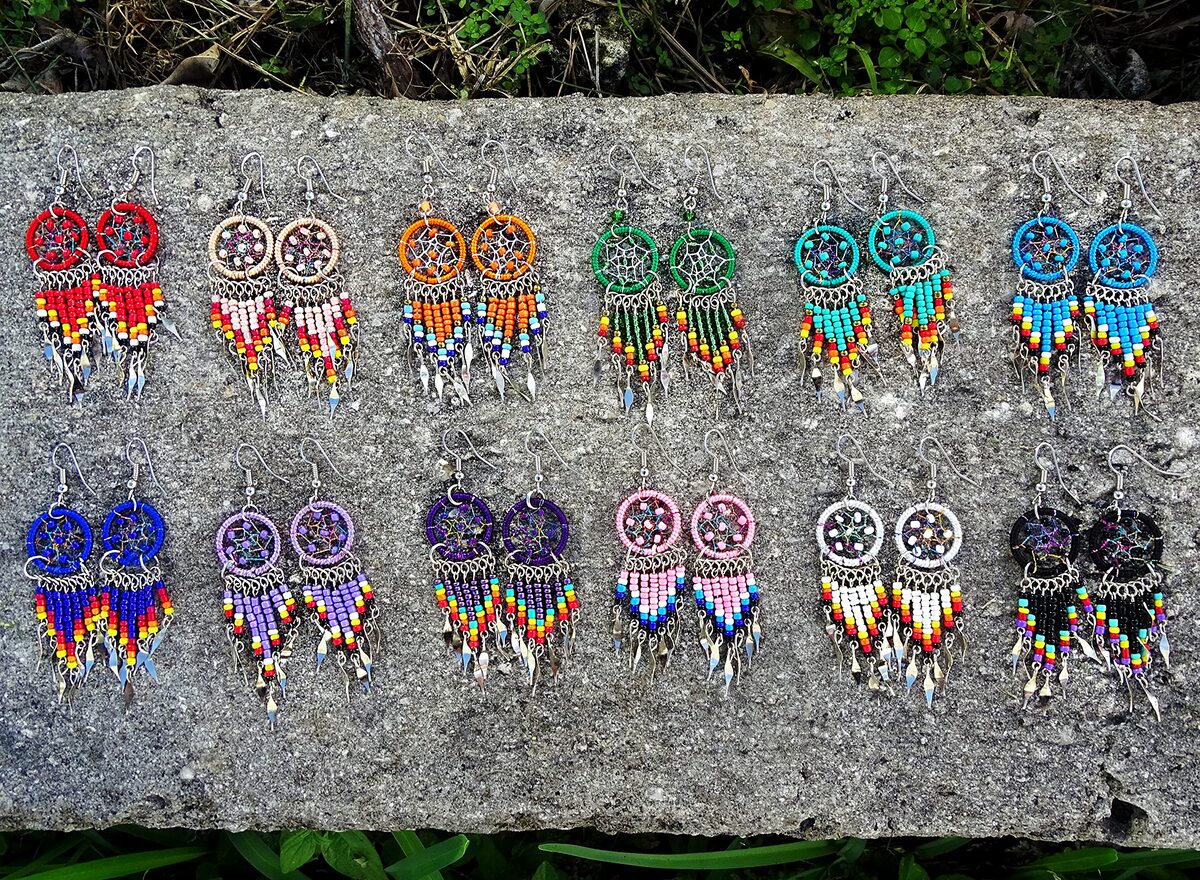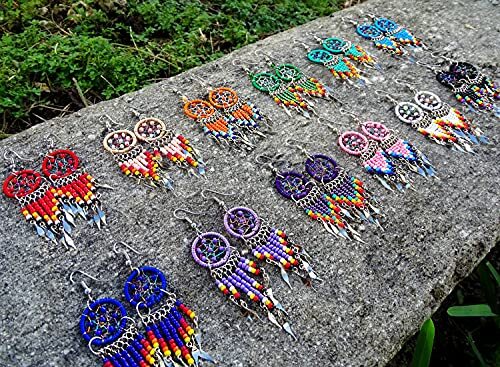 Product description: Round beaded thread dream catcher earrings with long seed bead and alpaca silver dangles in Native American inspired color combination. Express your love for handcrafted arts and culture with our colorful ethnic Native American inspired collection.