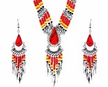 Teardrop-cut stone beaded multi strand chain necklace with long seed bead and alpaca silver metal dangles and matching earrings in Native American inspired color combination.