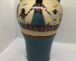 This beautiful Native American Tawa Pottery vase stands 13 inches tall and is crafted with a heavy glaze and textured surface. The vase is hand-painted with Southwest-style imagery, featuring a woman and children holding hands, with natural desert elements in the background.