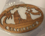 You are purchasing a brand new wall sign with the image of the Nativity Scene carved in olive wood brought back from Bethlehem, has about a 1" (in height) hanging gold tone chain on it. Very nicely detailed. If you wish you can hang it on a christmas tree or display on an easel.