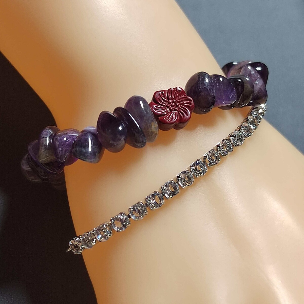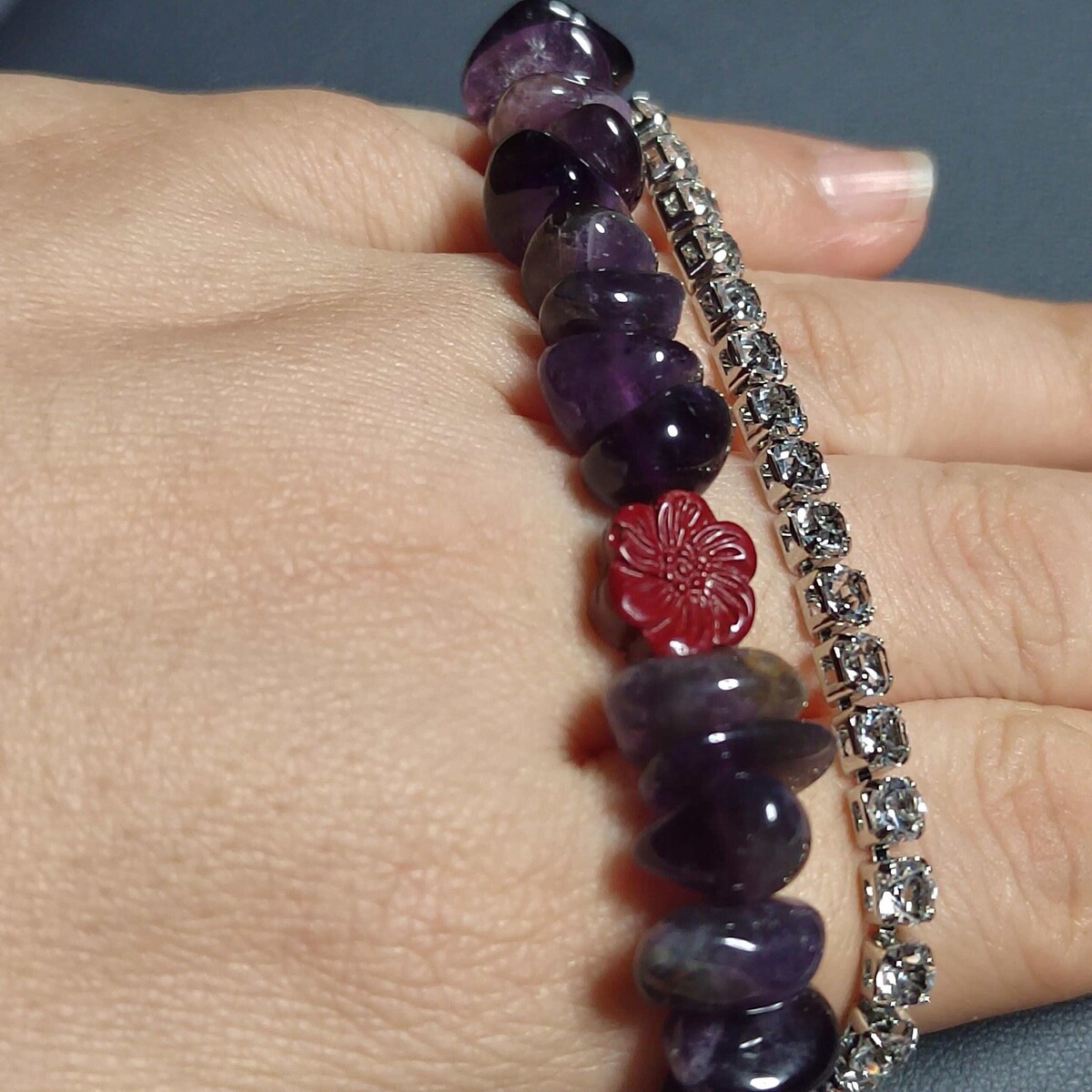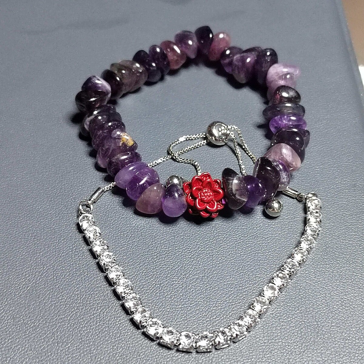 ? Natural Purple Amethyst Quartz Bracelet Set Cinnabar Flower Charm Rhinestone Accent Adjustable Fit Mix-and-Match EleganceUnleash your unique style with this stunning mix-and-match bracelet set, blending the calming energy of natural purple amethyst quartz beads with the bold beauty of a cinnabar flower charm and the sparkle of a delicate rhinestone bracelet. Designed to offer both sophistication and playfulness, this set is perfect for casual outings, formal events, or meaningful gifting.Each bracelet is crafted with care, combining traditional Chinese-inspired motifs with modern elegance. The rich purple tones of the amethyst are complemented by vibrant red cinnabar and shimmering silver rhinestones, creating a layered look that?s both eye-catching and versatile. ? Why You?ll Love It? Natural amethyst quartz beads with uneven sizing for organic charm? Cinnabar flower charm symbolizes good fortune, happiness, and transformation? Rhinestone bracelet adds a touch of sparkle and modern flair? Adjustable and stretchable design ensures a comfortable fit? 925 silver-plated alloy for durability and shine? Versatile styling ? wear together or mix with other accessories? Ideal for gifting, spiritual wear, or everyday elegance ? Product Details? Materials: Natural Purple Amethyst Quartz, Cinnabar, Rhinestones, Silver-Plated Alloy? Bead Size: Approx. 9?11.4mm (average 11.9mm)? Fit: Adjustable and stretchable? Colors: Rich purple, vibrant red, sparkling silver? Style: Layered, symbolic, elegant? Occasion: Daily wear, parties, anniversaries, gifting ? Packaging Includes? Elegant Jewelry Box? Velvet Jewelry Pouch? Cleaning Cloth? Zip Lock Bag ? Care Instructions? Avoid contact with perfumes, hairsprays, and harsh chemicals? Store in the provided pouch or zip lock bag to prevent scratches and dust? Clean gently with a soft cloth; avoid abrasive materials? Remove during swimming or strenuous activity? Periodically inspect and consult a jeweler for maintenance ? A poetic fusion of gemstone energy, cultural symbolism, and modern design?this bracelet set is perfect for those who appreciate meaningful accessories, refined craftsmanship, and versatile beauty.