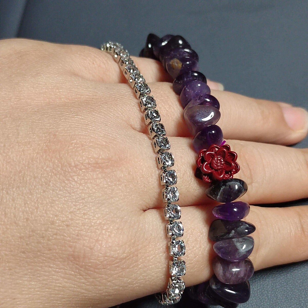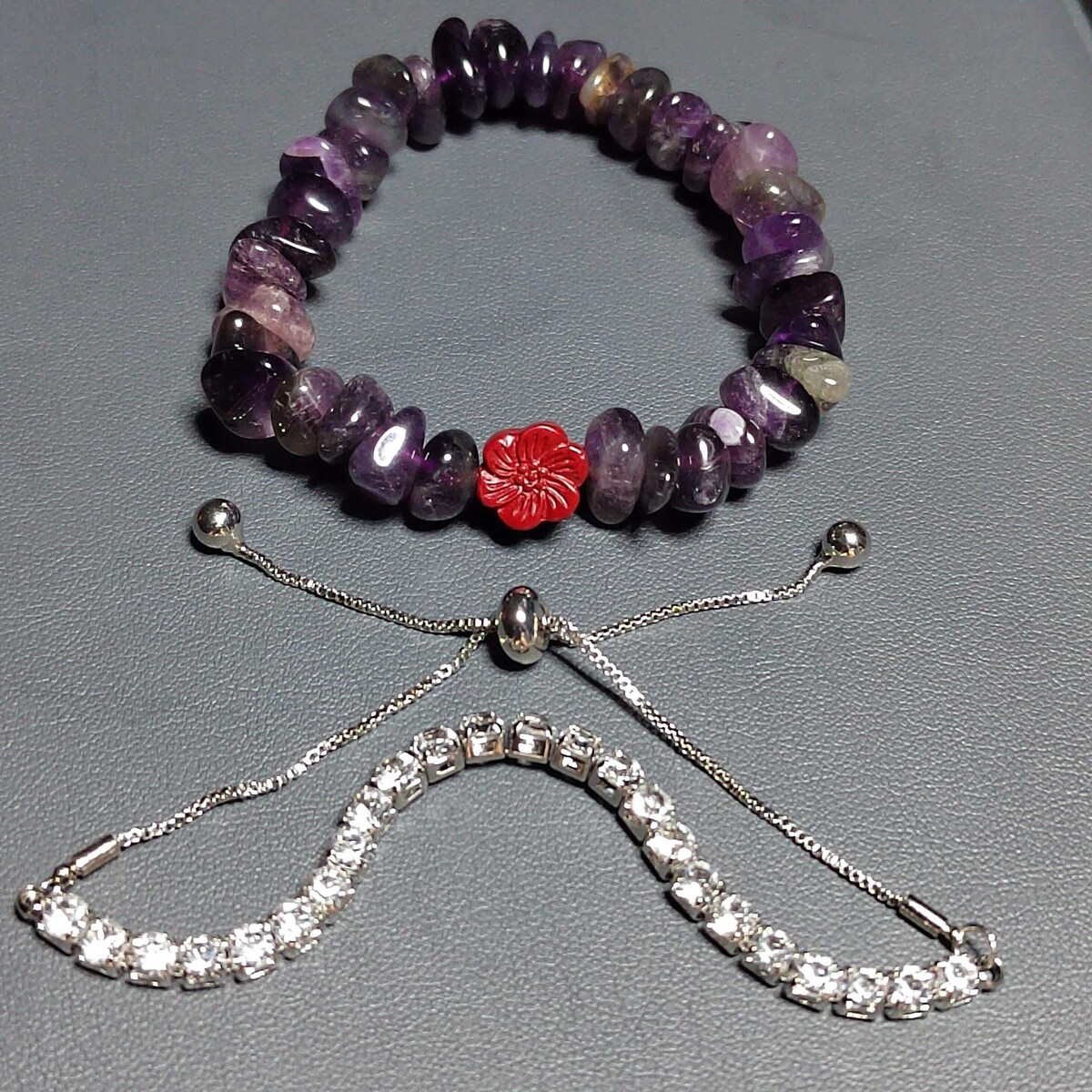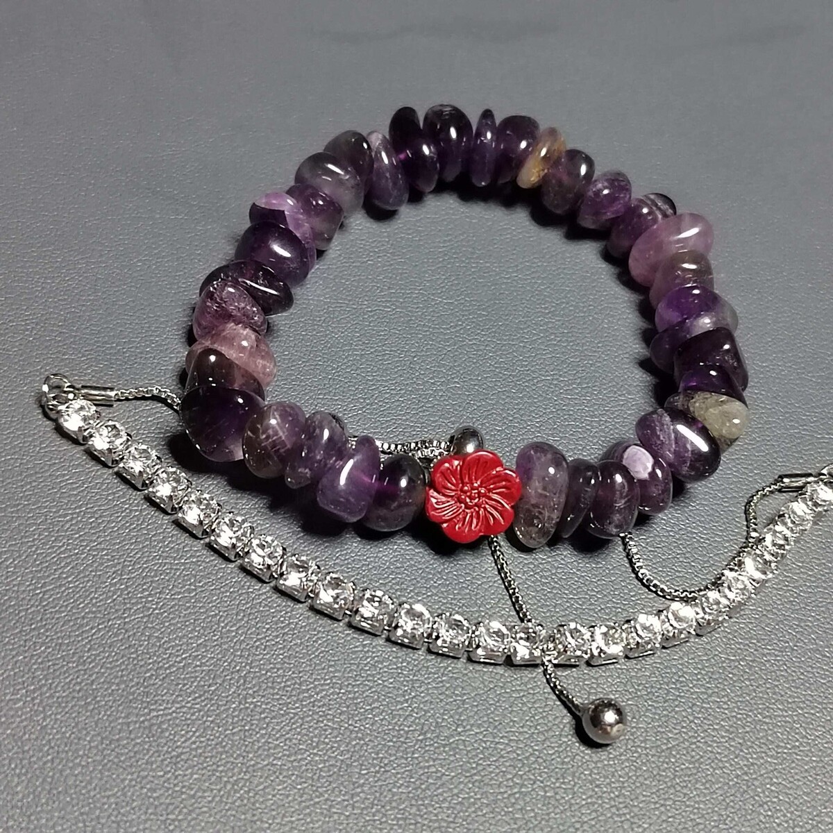 ? Natural Purple Amethyst Quartz Bracelet Set Cinnabar Flower Charm Rhinestone Accent Adjustable Fit Mix-and-Match EleganceUnleash your unique style with this stunning mix-and-match bracelet set, blending the calming energy of natural purple amethyst quartz beads with the bold beauty of a cinnabar flower charm and the sparkle of a delicate rhinestone bracelet. Designed to offer both sophistication and playfulness, this set is perfect for casual outings, formal events, or meaningful gifting.Each bracelet is crafted with care, combining traditional Chinese-inspired motifs with modern elegance. The rich purple tones of the amethyst are complemented by vibrant red cinnabar and shimmering silver rhinestones, creating a layered look that?s both eye-catching and versatile. ? Why You?ll Love It? Natural amethyst quartz beads with uneven sizing for organic charm? Cinnabar flower charm symbolizes good fortune, happiness, and transformation? Rhinestone bracelet adds a touch of sparkle and modern flair? Adjustable and stretchable design ensures a comfortable fit? 925 silver-plated alloy for durability and shine? Versatile styling ? wear together or mix with other accessories? Ideal for gifting, spiritual wear, or everyday elegance ? Product Details? Materials: Natural Purple Amethyst Quartz, Cinnabar, Rhinestones, Silver-Plated Alloy? Bead Size: Approx. 9?11.4mm (average 11.9mm)? Fit: Adjustable and stretchable? Colors: Rich purple, vibrant red, sparkling silver? Style: Layered, symbolic, elegant? Occasion: Daily wear, parties, anniversaries, gifting ? Packaging Includes? Elegant Jewelry Box? Velvet Jewelry Pouch? Cleaning Cloth? Zip Lock Bag ? Care Instructions? Avoid contact with perfumes, hairsprays, and harsh chemicals? Store in the provided pouch or zip lock bag to prevent scratches and dust? Clean gently with a soft cloth; avoid abrasive materials? Remove during swimming or strenuous activity? Periodically inspect and consult a jeweler for maintenance ? A poetic fusion of gemstone energy, cultural symbolism, and modern design?this bracelet set is perfect for those who appreciate meaningful accessories, refined craftsmanship, and versatile beauty.