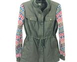 EUC, Natural Reflections olive green jacket with multi color sweater sleeves is perfect for everyday casual wear. Waist is adjustable. Closes with snaps and zipper. Great look for fall and winter.