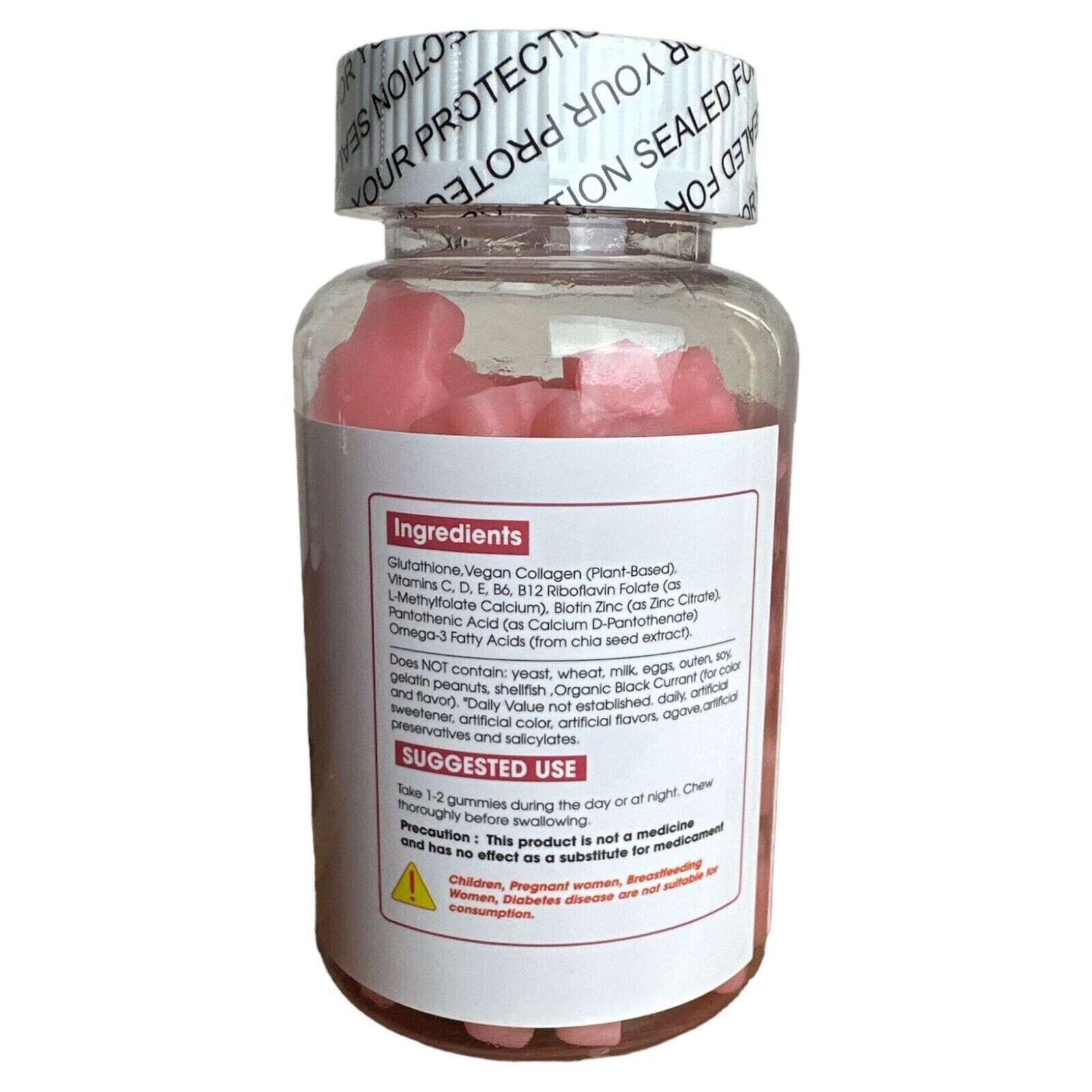Glutathione, Vegan Collagen (Plant-Based). Vitamins C, D, E. B6, B12 Riboflavin Folate (as L-Methylfolate Calcium). Biotin Zinc (as Zinc c Citrate). Pantothenic Acid (as Calcium D-Pantothenate) Omega-3 Fatty Acids (from chia seed extract).