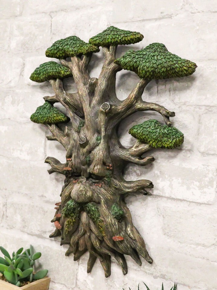 ? Introducing the Leafy Greenman Tree Wall Plaque, a nature-inspired masterpiece that effortlessly brings the essence of the outdoors into any space. This captivating plaque showcases a whimsical tree design with leafy canopies on six branches. The tree trunk forms a unique face, complete with closed eyes, a prominent nose, and cascading roots that create a beard. Adorned with charming brown mushrooms, this exquisite wall plaque adds enchantment to your home or office decor.