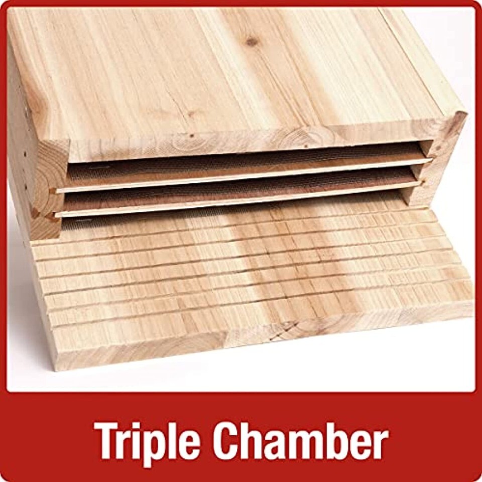 Bats often consume their own body weight in insect pests every night - helping you keep bug populations in check naturally without the use of harmful chemicals! This sturdy triple-chamber design provides the roost space that bats prefer for optimum bat capacity. Constructed from premium Cedar using stainless steel screws, this bat house is built to last. The innovative design of this house includes landing kerfs, nylon hanging mesh, removable chambers, and vents for optimum air circulation to ensure the health and safety of its inhabitants.