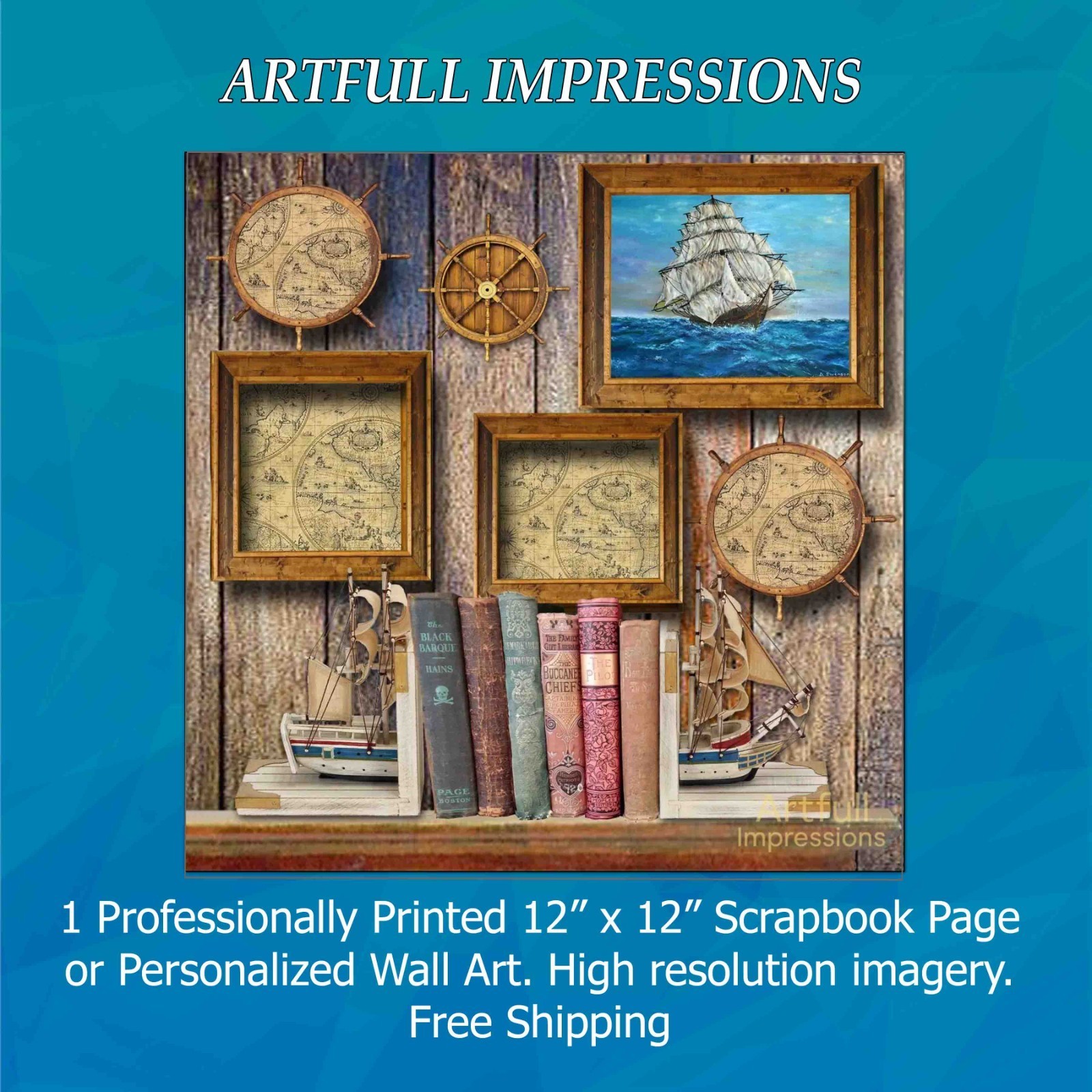 Nautical - Antique Map & Maritime Library Scene Wall Art or Scrapbook Page
