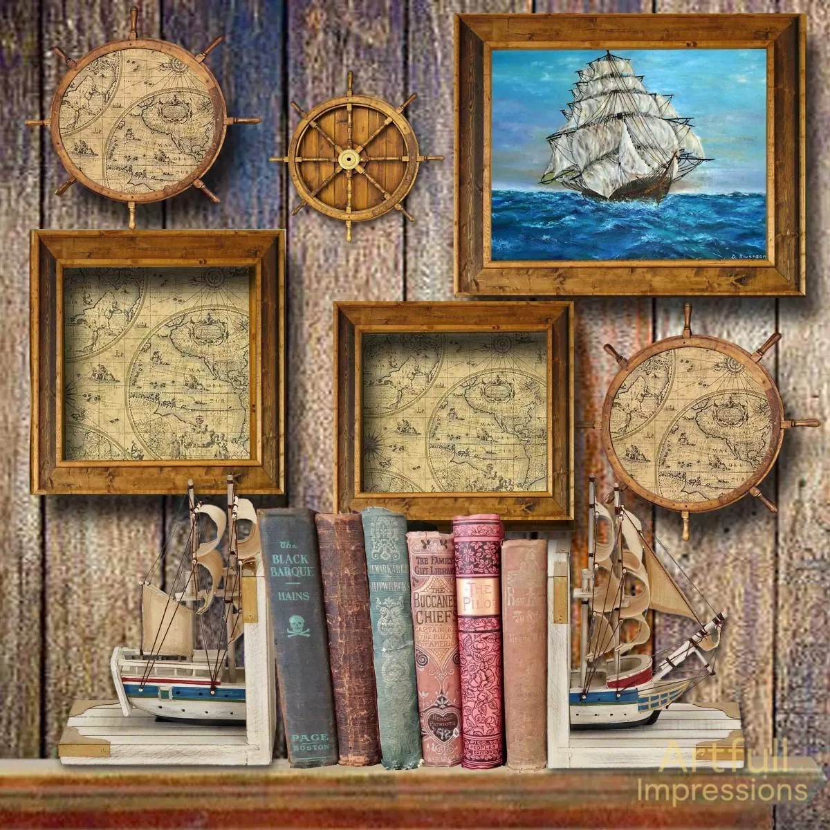 artwork features vintage world maps in rustic frames, wooden ship wheels, model
