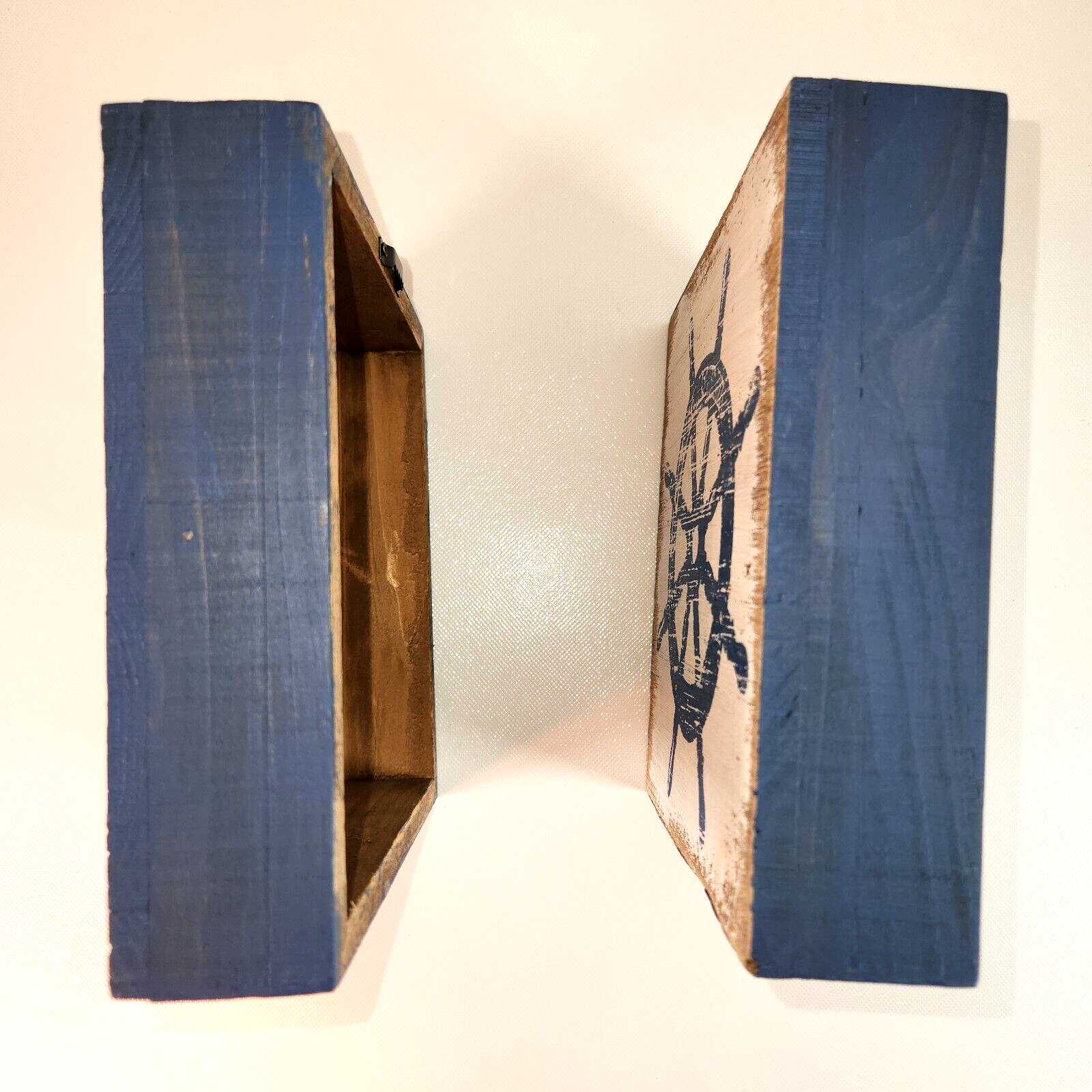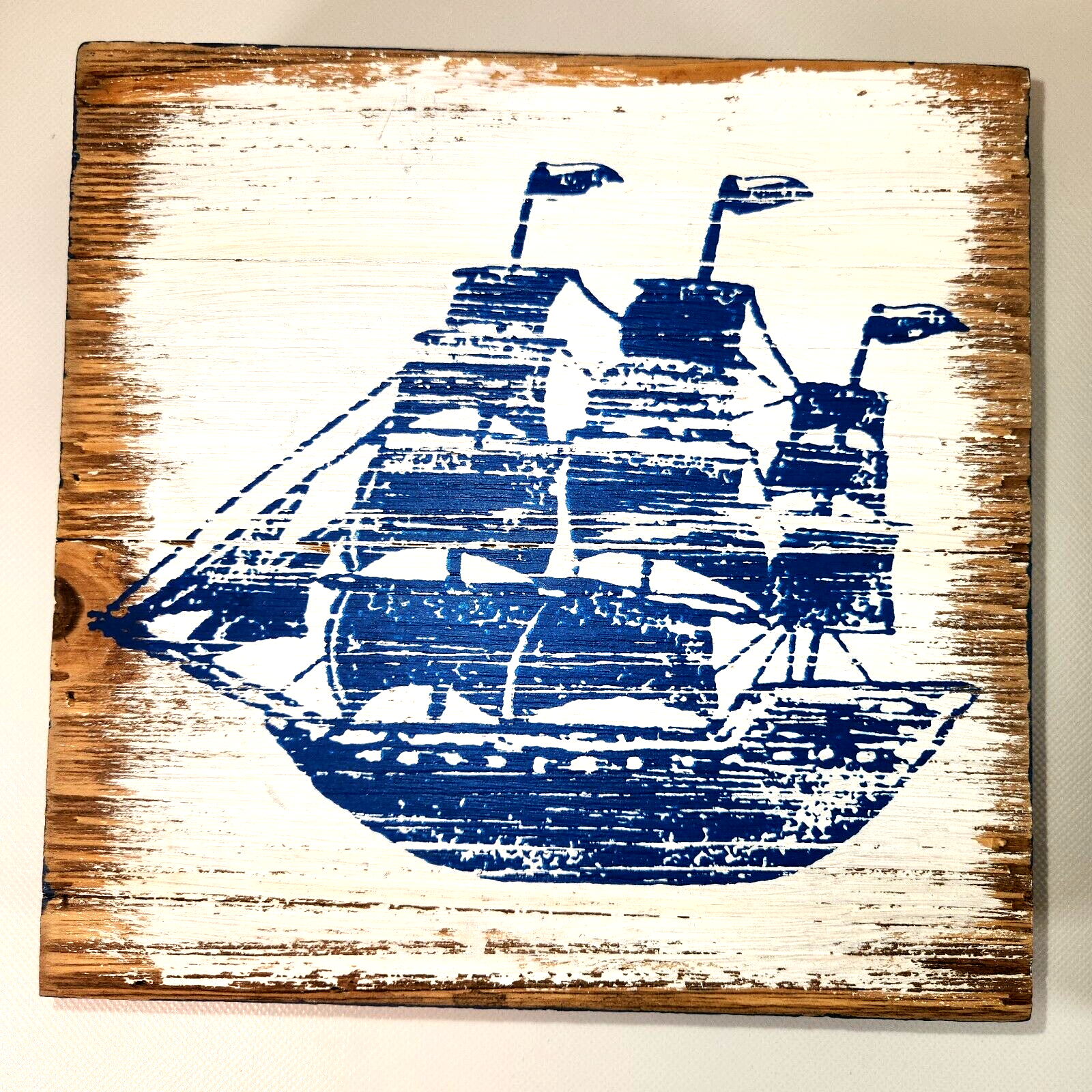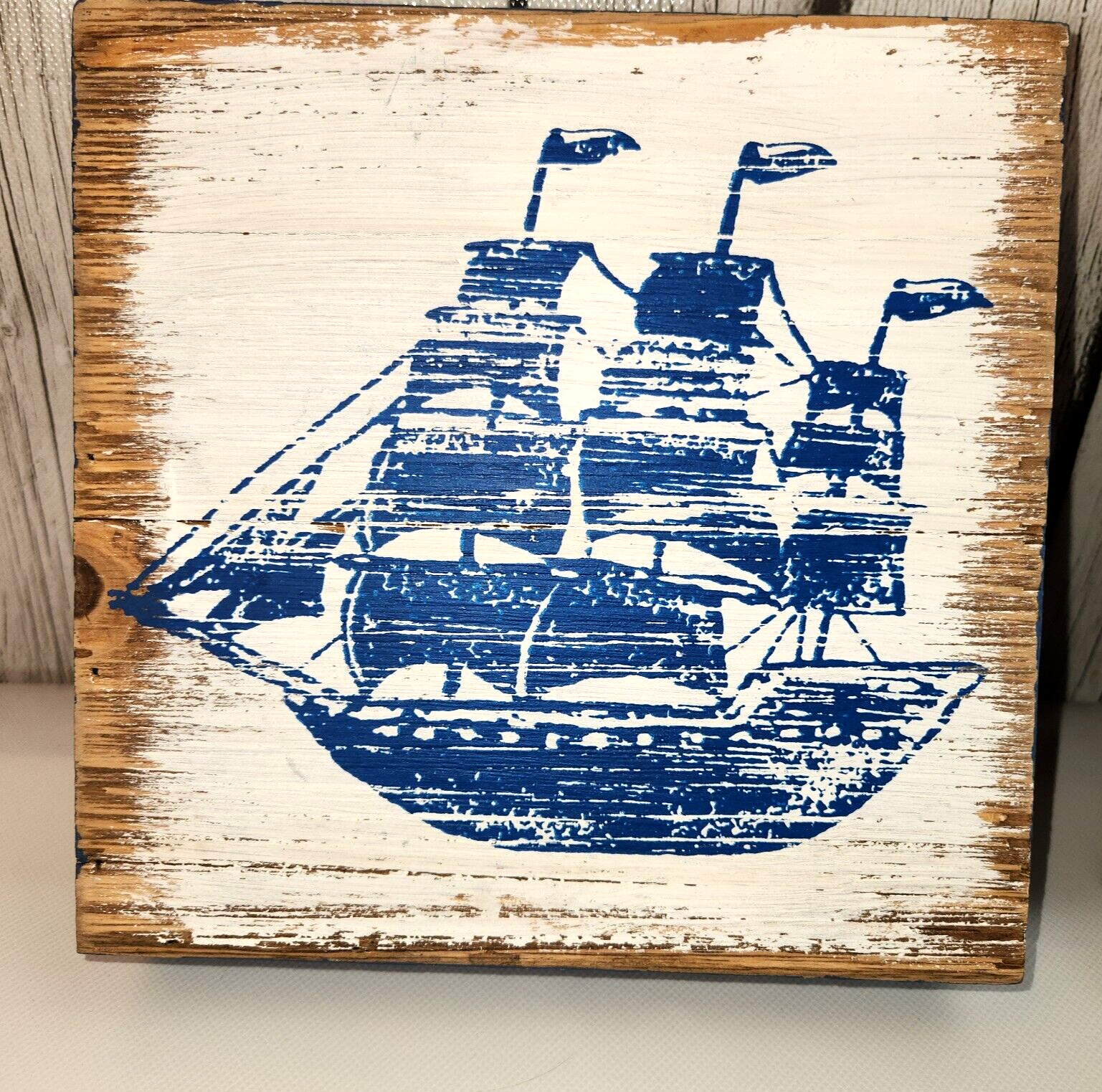 ? Painted blue and white wood with weathered coastal style