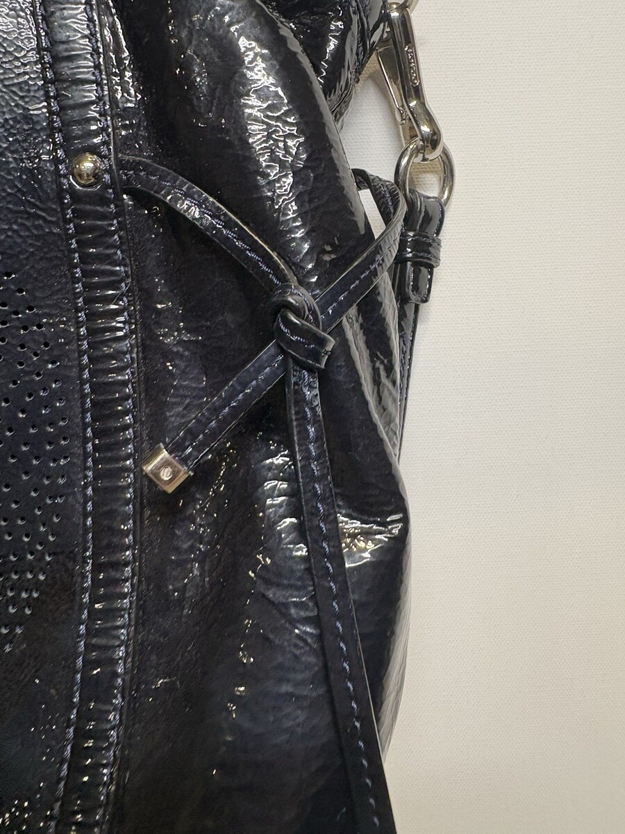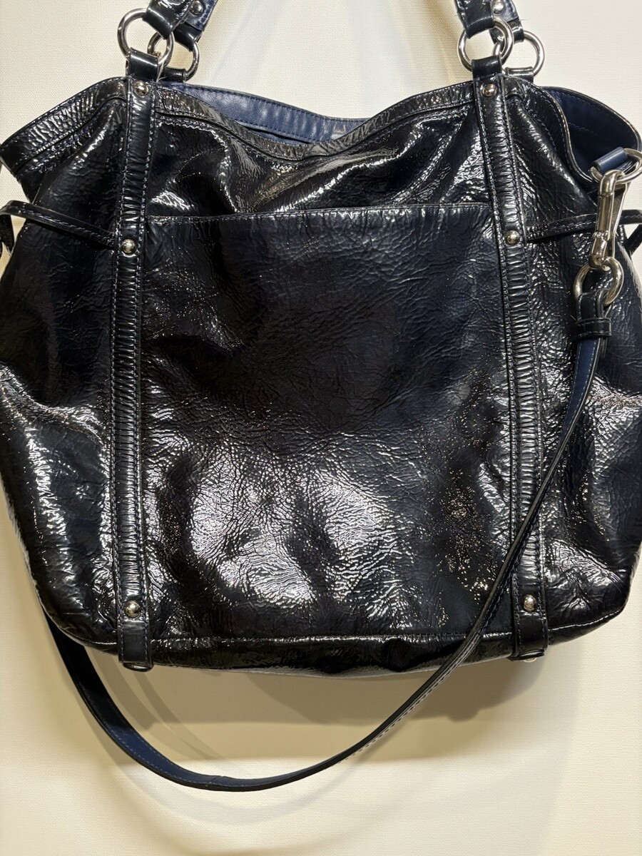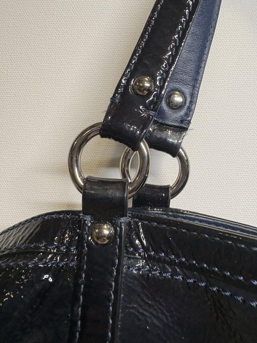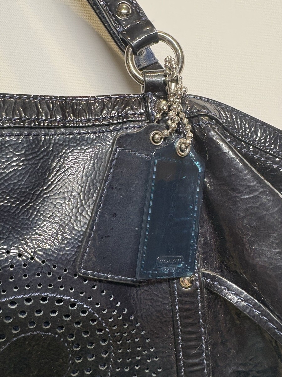 The Navy Blue Patent Leather Coach Audrey Tote is a stylish and practical handbag designed for women by the renowned brand Coach. Made from high-quality patent leather, this tote features a spacious interior with inner pockets for organization. The durable patent leather handle/strap ensures easy carrying, making it a perfect accessory for any outfit. With its sleek design and classic tote style, this handbag is a versatile and fashionable choice for everyday use.