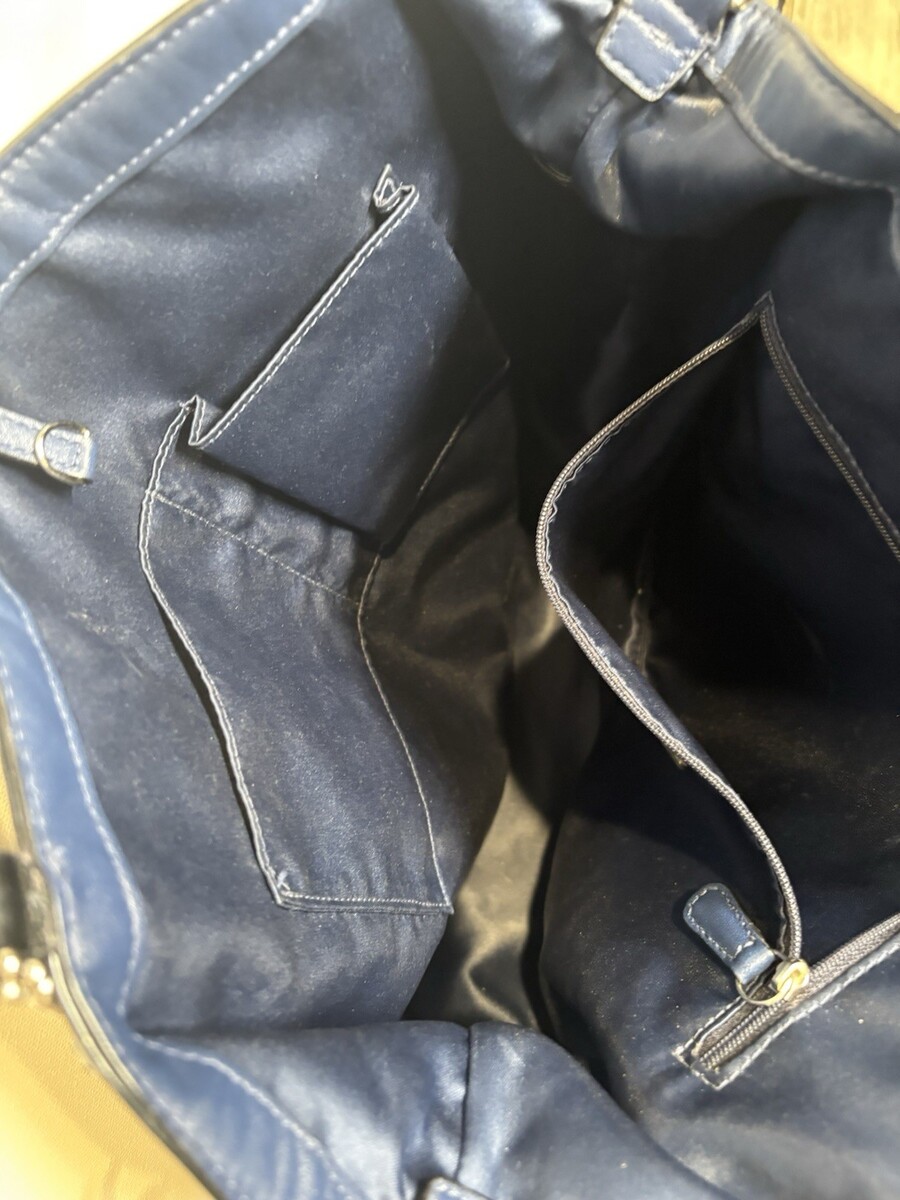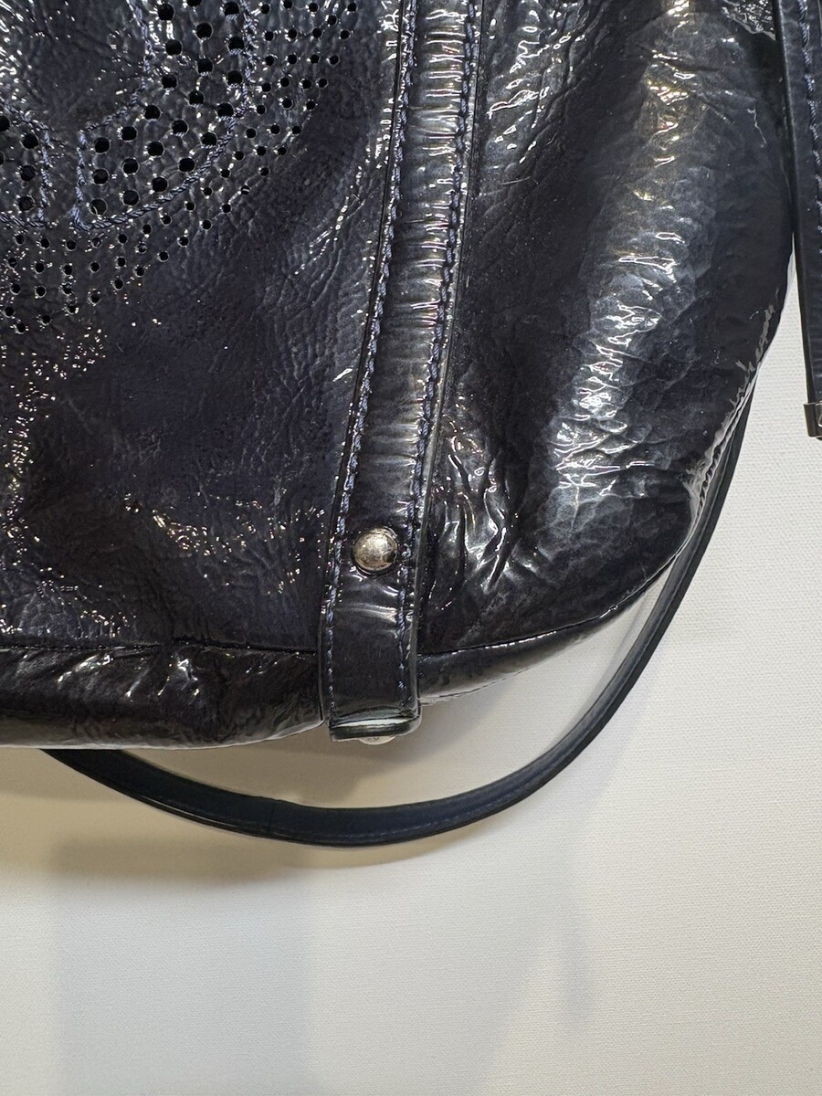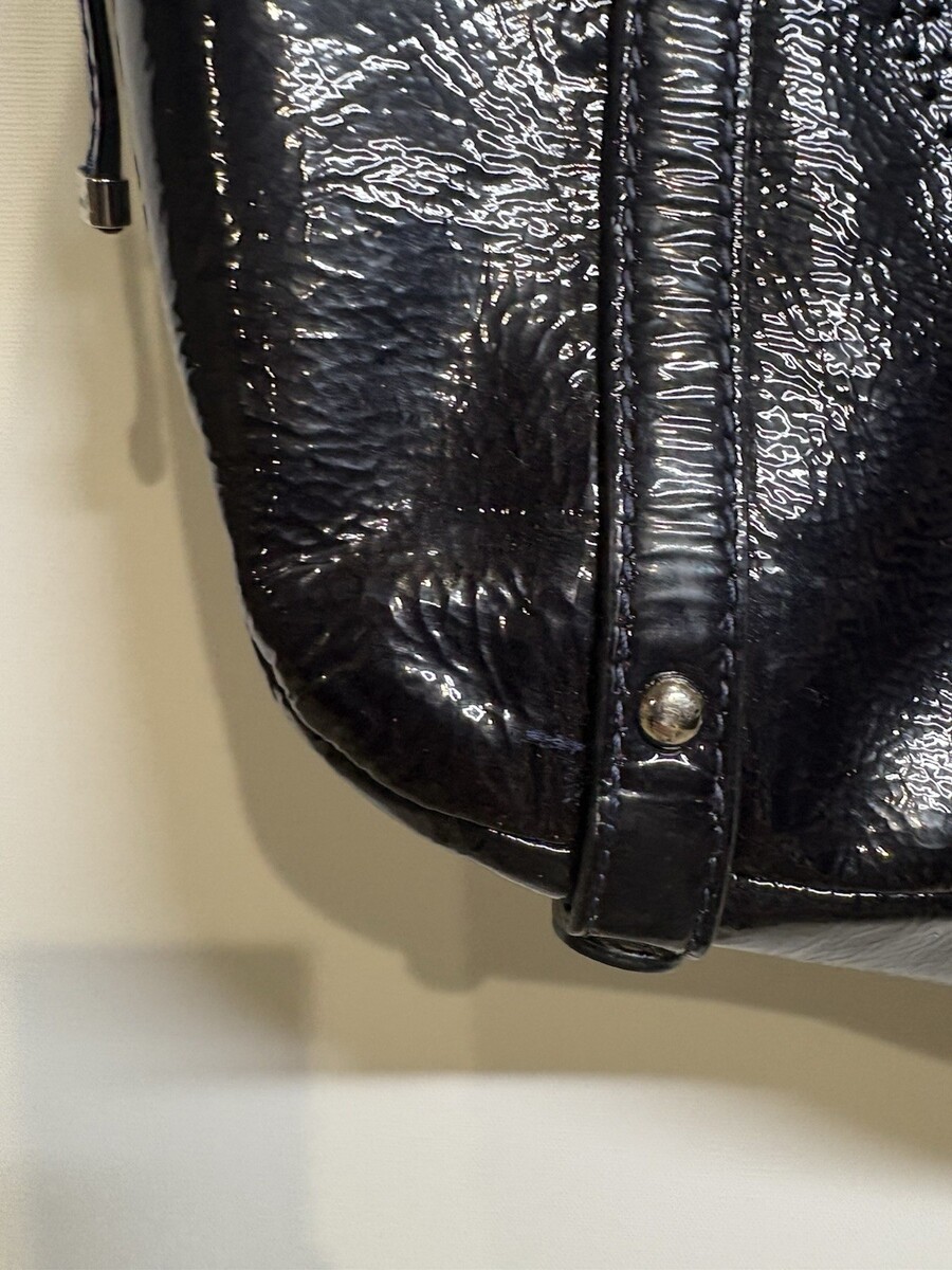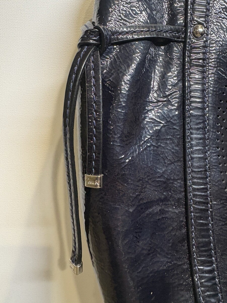 The Navy Blue Patent Leather Coach Audrey Tote is a stylish and practical handbag designed for women by the renowned brand Coach. Made from high-quality patent leather, this tote features a spacious interior with inner pockets for organization. The durable patent leather handle/strap ensures easy carrying, making it a perfect accessory for any outfit. With its sleek design and classic tote style, this handbag is a versatile and fashionable choice for everyday use.
