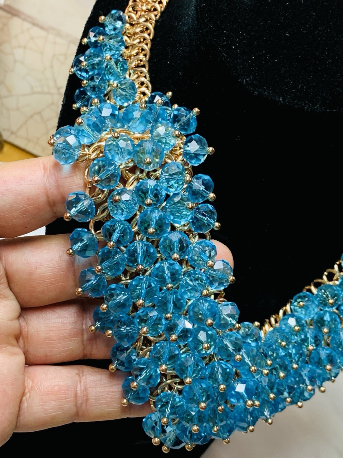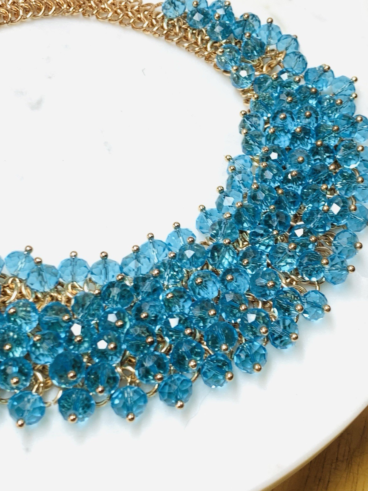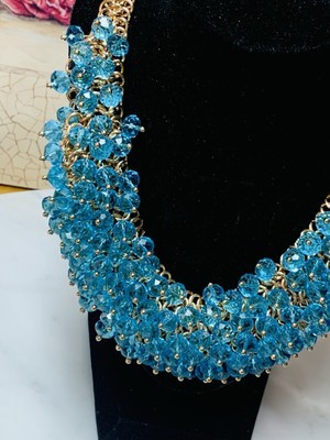 - Necklace Statement Blue Crystals Charms Gold Tone