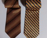 The product is a lot of two designer geometric micro pattern neckties by Carlos Devenezia, made of 100% silk. The ties are woven in a geometric pattern with a gold/blue and gold/black colors and feature the logo They are approximately 61 3/4" long and 4" wide, making them a stylish and high-quality accessory for men who appreciate designer pieces. The ties are handmade and offer a unique and sophisticated addition to any formal ensemble. Normal wear.