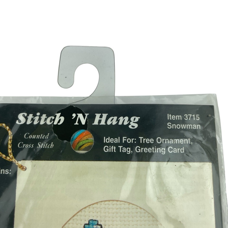 This NeedleMagic Inc. Stitch 'N Hang Counted Cross Stitch Ornament Kit features the festive Snowman design (Item 3715). The kit includes 18 count Aida fabric, floss, a needle, die-cut card, backing card, a graph, gold thread for hanging and easy-to-follow instructions. This ornament is shown actual size on the packaging, making it perfect for holiday decorating or gifting.