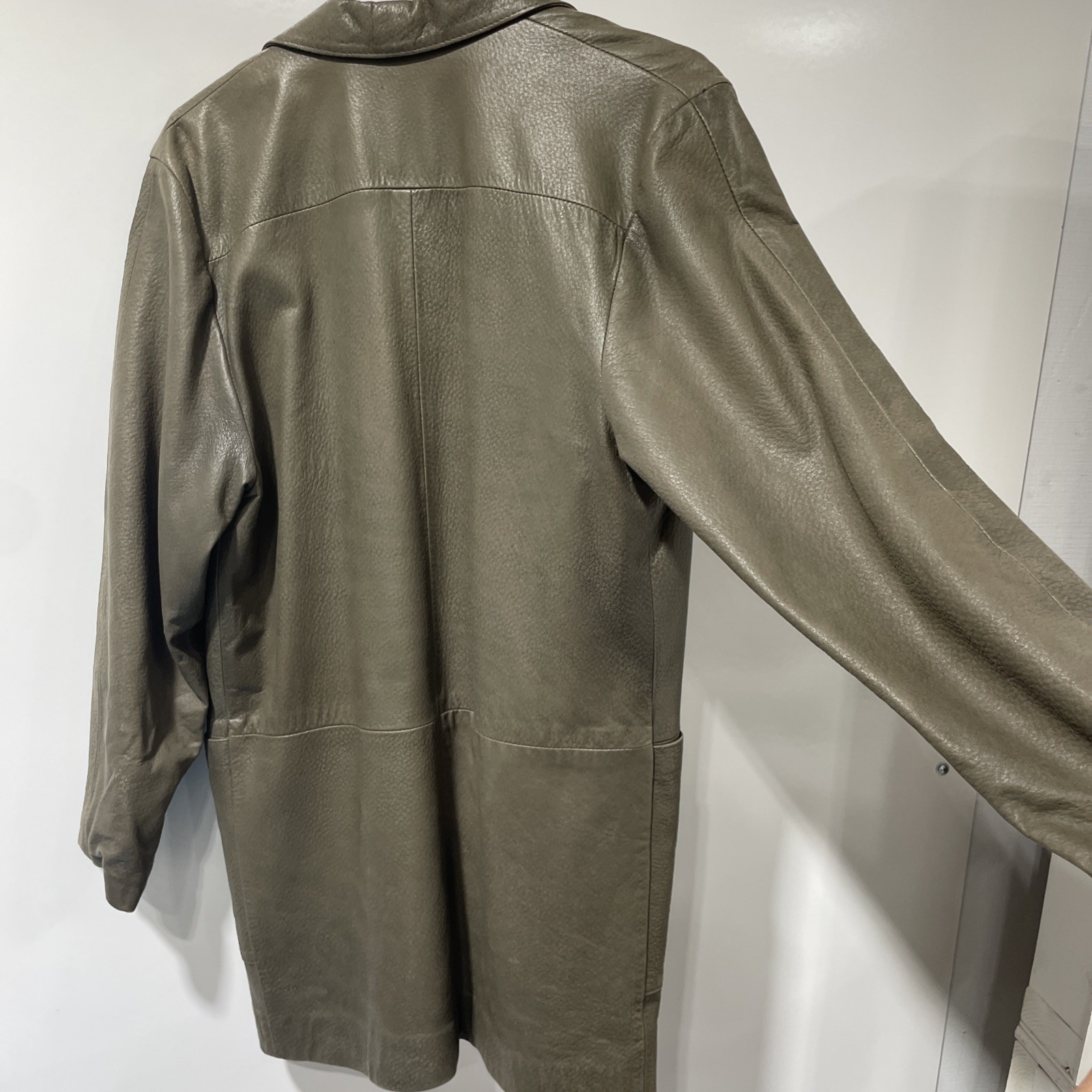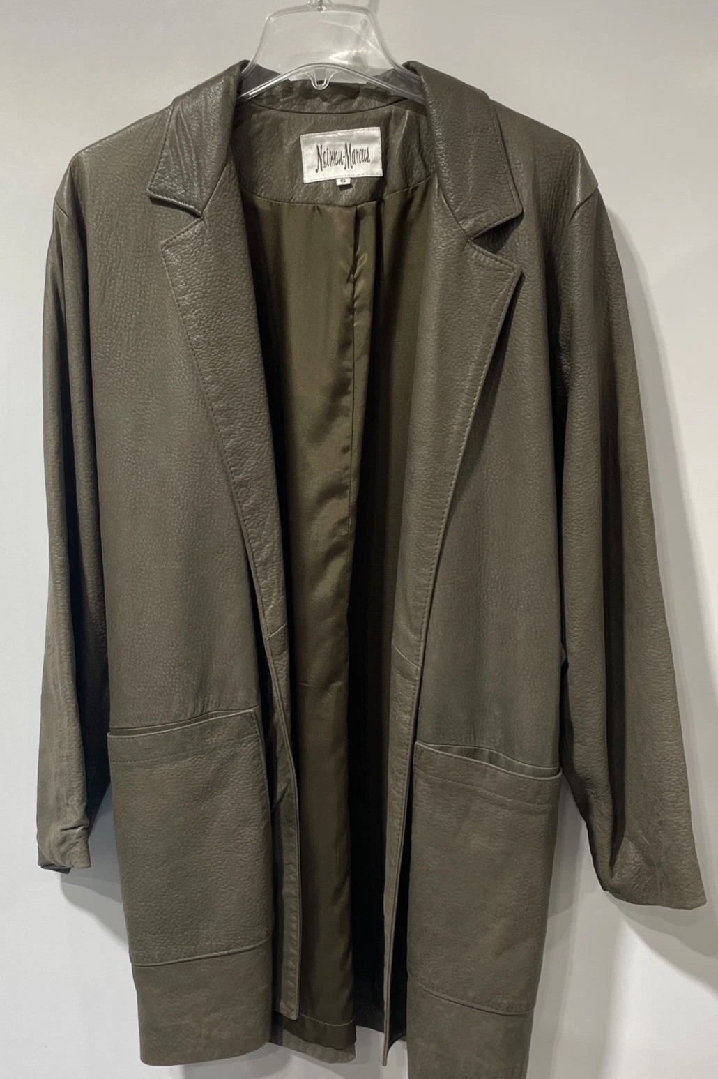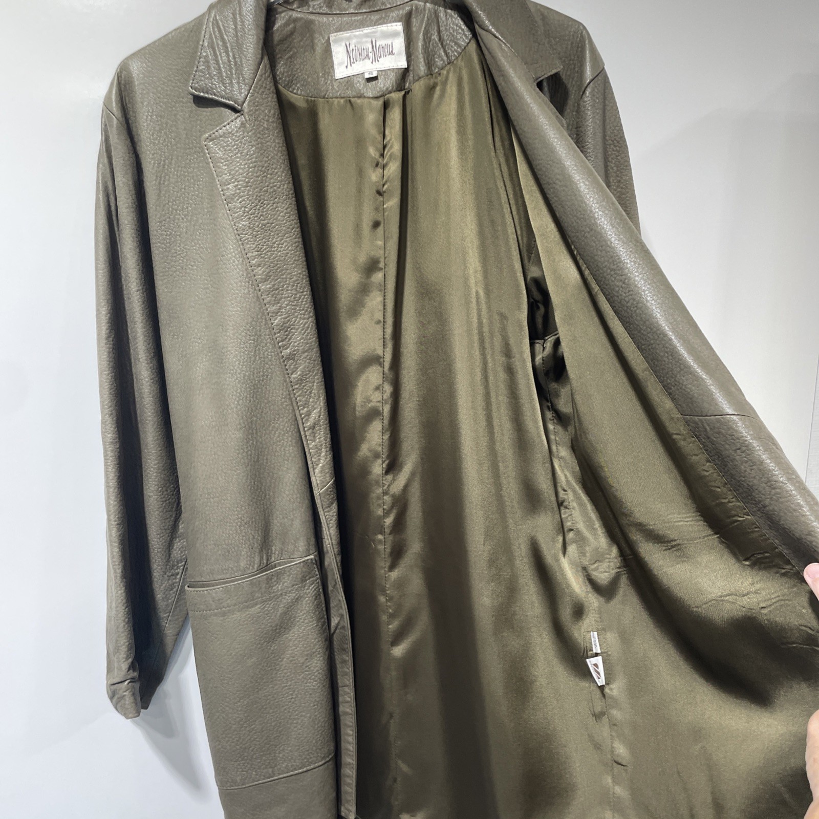 The product is a Neiman Marcus green leather open jacket in size small. It features a long style with two outside pockets and is in very good condition. This jacket is perfect for adding a touch of sophistication to any outfit, especially for those looking for a stylish and versatile outerwear option. Made from high-quality leather, this jacket is sure to become a staple in any man's wardrobe.